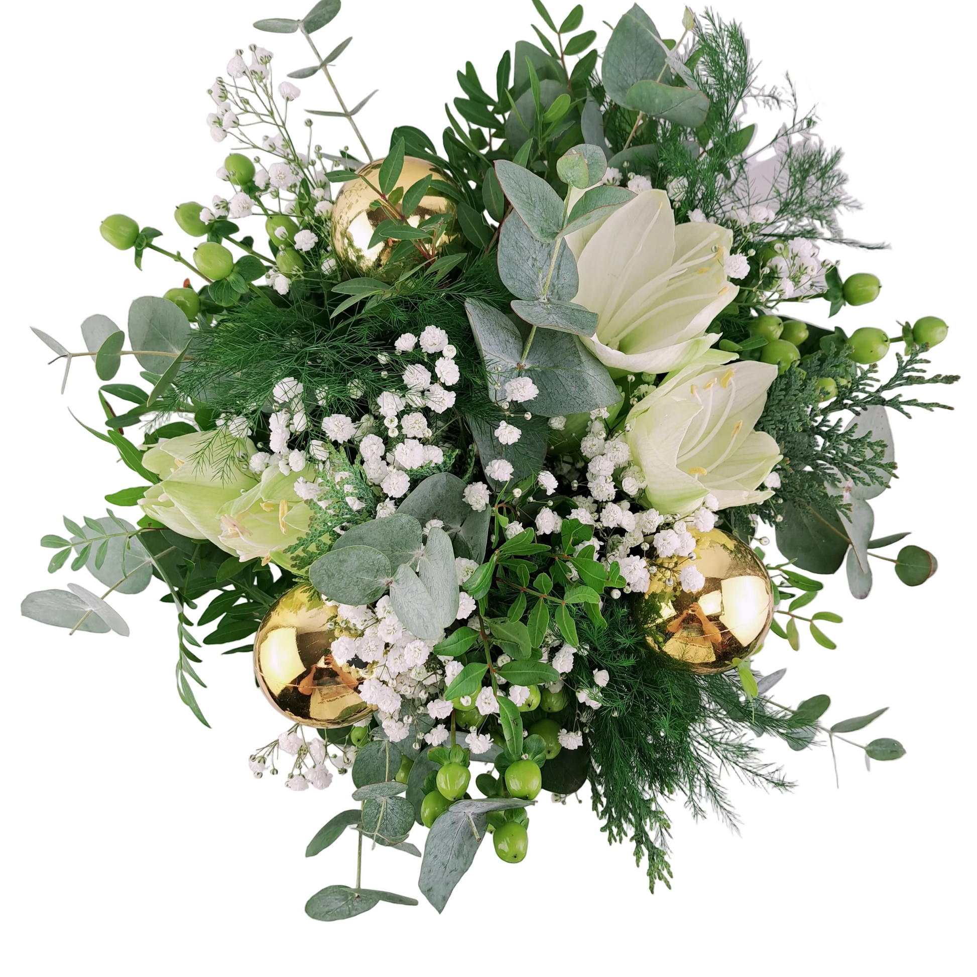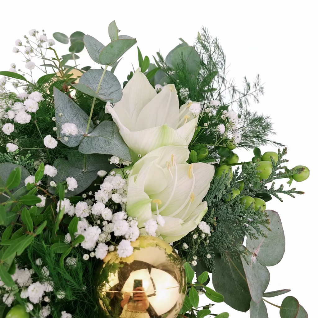 Biely amaryllis s eukalyptom je elegantná a svieža zimná kytica, ktorá zaujme svojou čistotou a jemnosťou. Dominantné biele amarylisy symbolizujú čistotu a noblesu, zatiaľ čo bohatý eukalyptus dodáva kompozícii moderný vzhľad a príjemnú, sviežu vôňu. Zelené hypericum a gypsophilla zjemňujú celkový dojem a vytvárajú prirodzenú harmóniu.