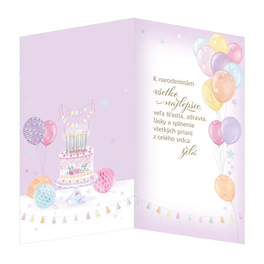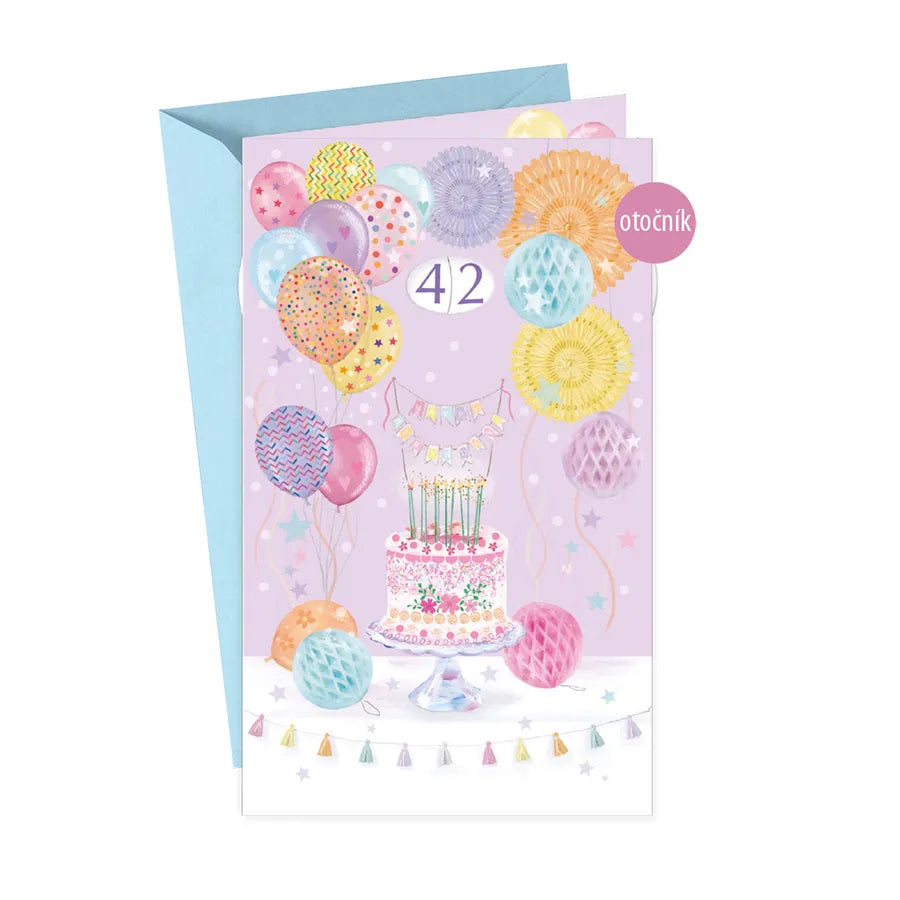 Blahoželanie k narodeninám s otočníkom a textom vo vnútri. Otočník umožňuje výber veku obdarovaného (od 10 po 99). Súčasťou priania je aj farebne zladená obálka.