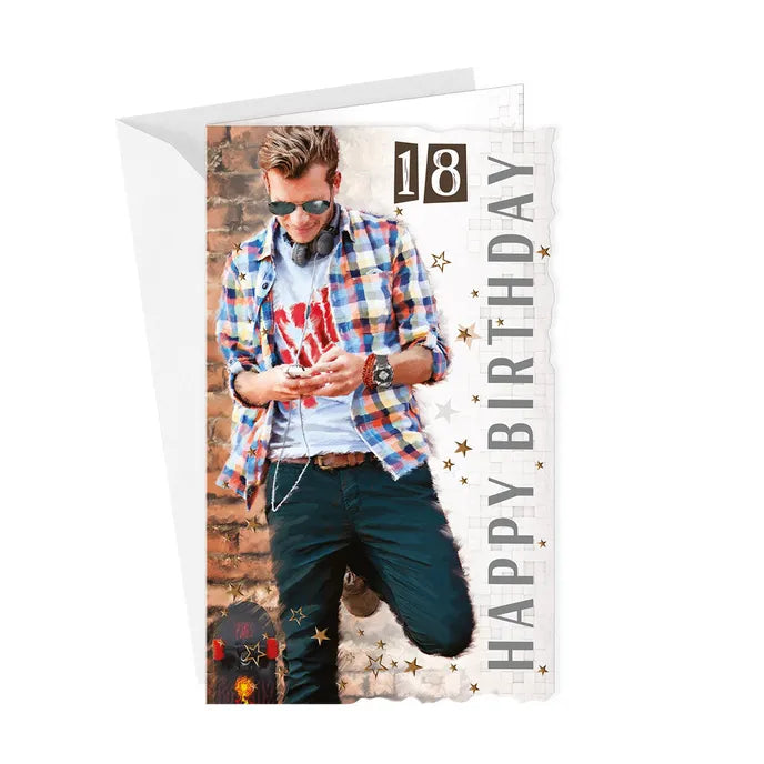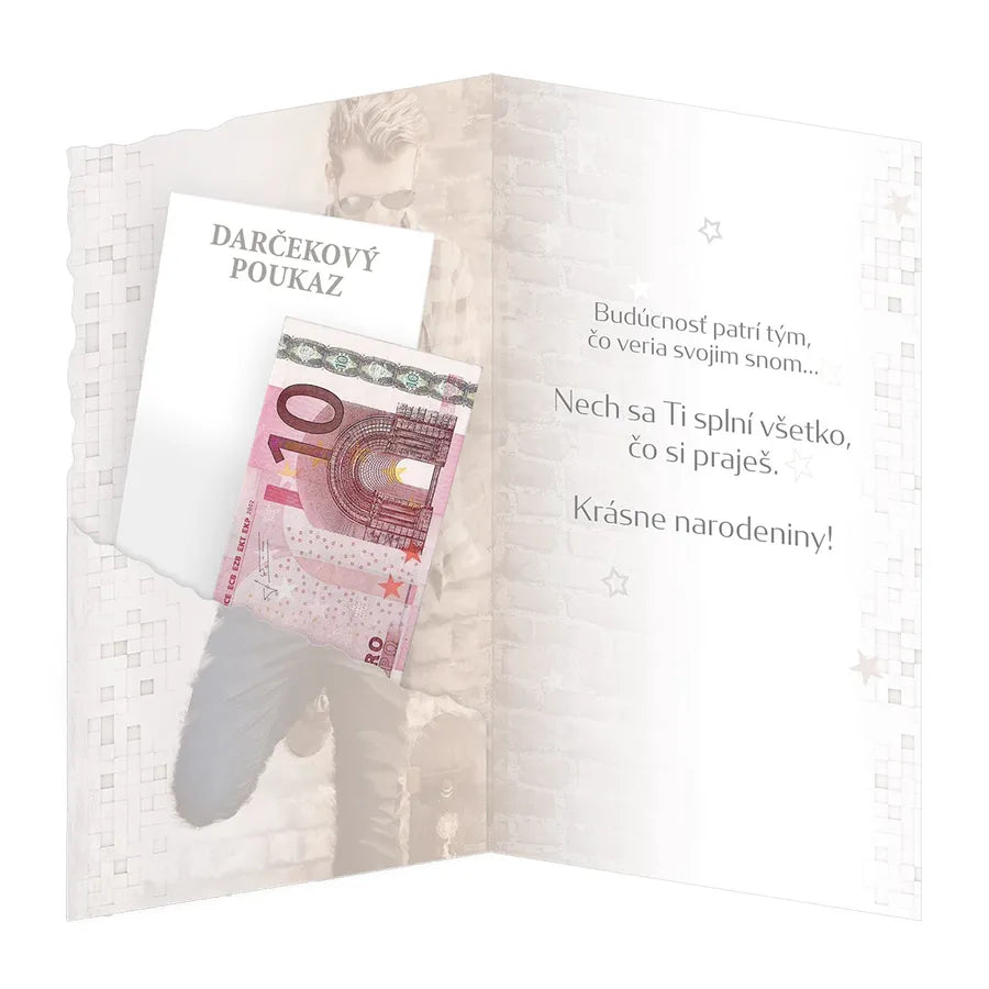 Blahoželanie k 18. narodeninám s textom a záložkou na peniaze vo vnútri blahoželania. Súčasťou priania je aj farebne zladená obálka.