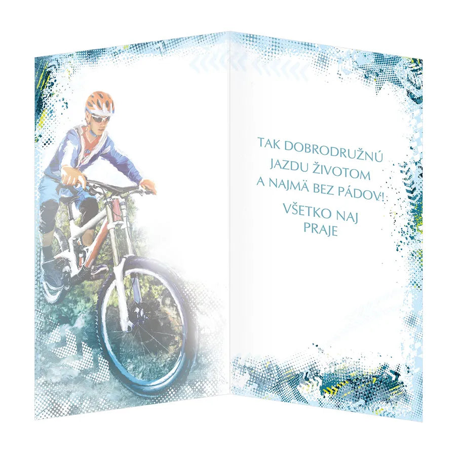 Blahoželanie k 18. narodeninám pre bikera s textom vo vnútri blahoželania: "Tak dobrodružnú jazdu životom a najmä bez pádov! Všetko naj praje" Súčasťou priania k narodeninám je aj farebne zladená obálka.