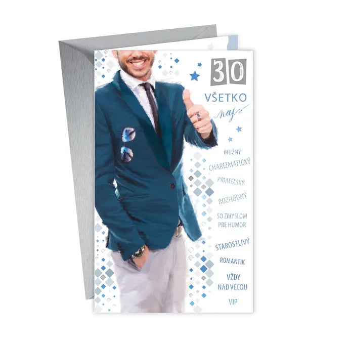 Blahoželanie k 30. narodeninám pre muža s textom vo vnútri. Súčasťou priania k narodeninám je aj farebne zladená obálka.