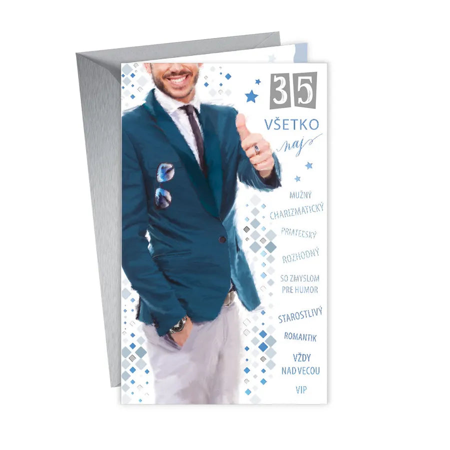 Blahoželanie k 35. narodeninám pre muža s textom vo vnútri. Súčasťou priania k narodeninám je aj farebne zladená obálka.