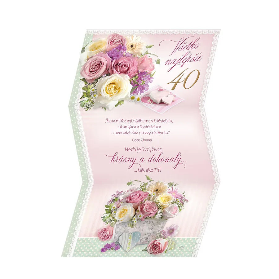 Blahoželanie pre ženu k 40. narodeninám - listina. S textom vo vnútri priania. Súčasťou balenia je aj farebne zladená obálka.