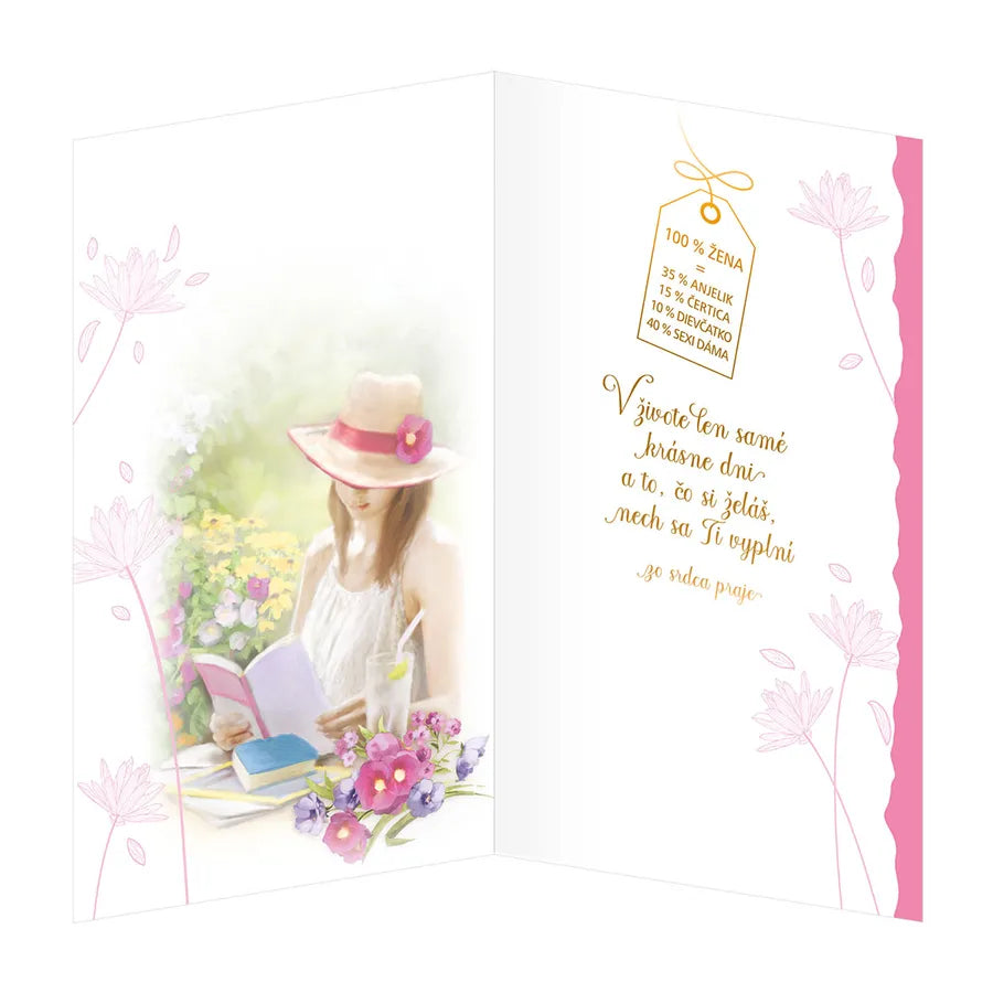 Blahoželanie k 40. narodeninám pre ženu s textom vo vnútri. Súčasťou priania k narodeninám je aj farebne zladená obálka.