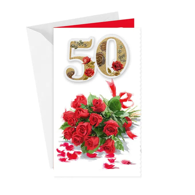 Blahoželanie k 50. narodeninám pre ženu s textom vo vnútri. Súčasťou priania k narodeninám je aj farebne zladená obálka.