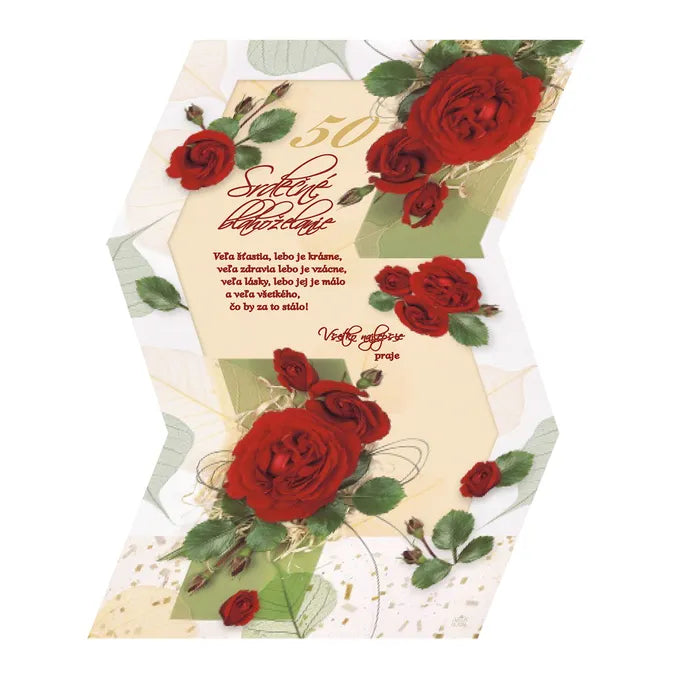 Blahoželanie k 50. narodeninám - listina skladacia A4. S textom vo vnútri priania. Súčasťou balenia je aj farebne zladená obálka. Po zložení je blahoželanie v rozmere DL obálky.