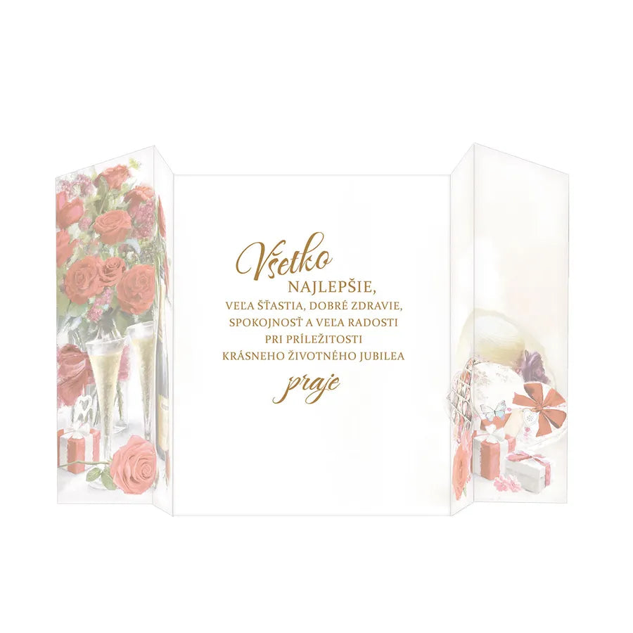 Blahoželanie pop up k 60. narodeninám s textom na zadnej strane. Efekt skladania umocňuje dojem priestoru. Prianie je možné postaviť. Súčasťou balenia je aj farebne zladená obálka.