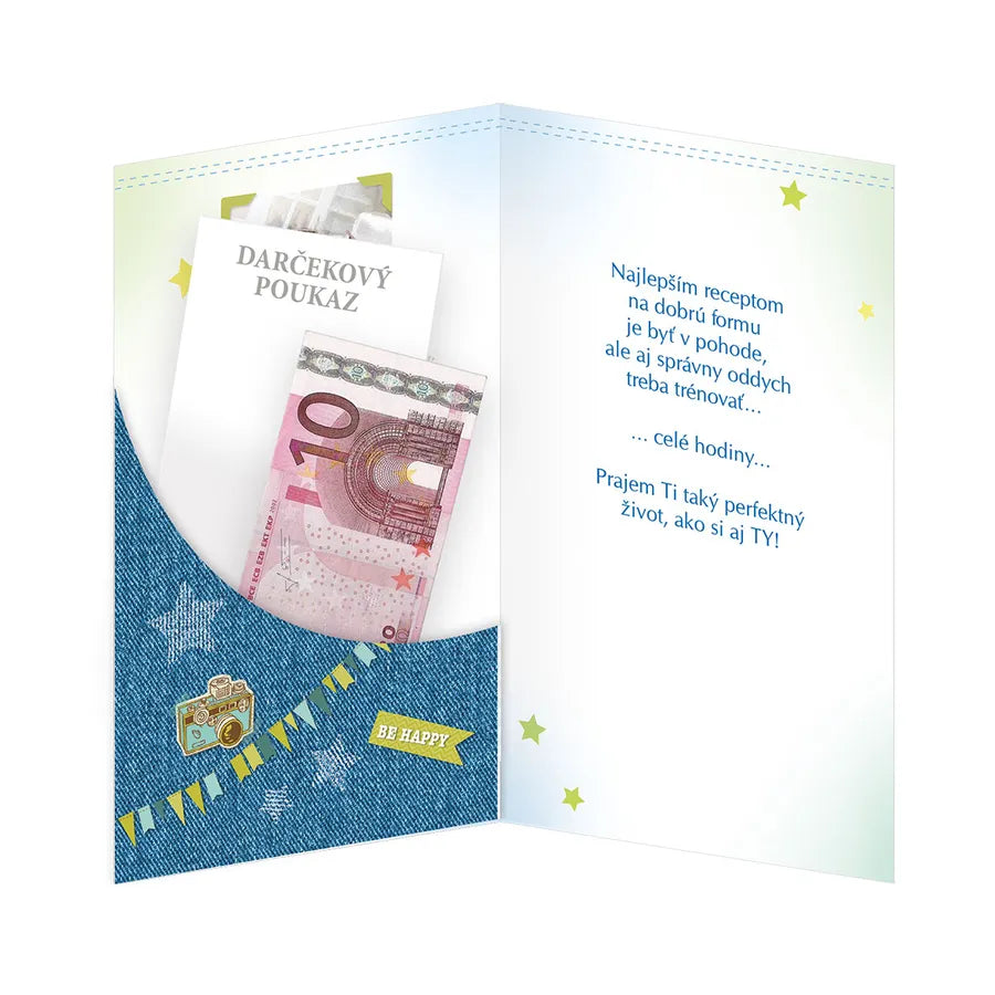 Blahoželanie k 60. narodeninám s textom a záložkou na peniaze vo vnútri blahoželania. Súčasťou priania je aj farebne zladená obálka.