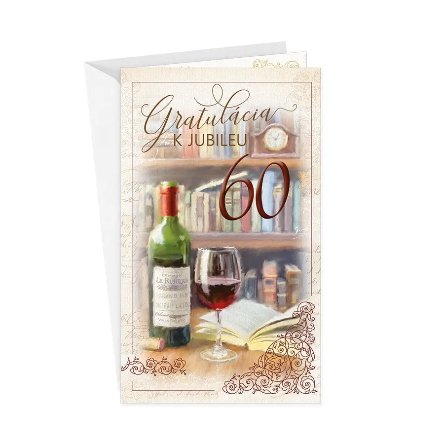 Blahoželanie k 60. narodeninám s textom a záložkou na peniaze vo vnútri blahoželania. Súčasťou priania je aj farebne zladená obálka.