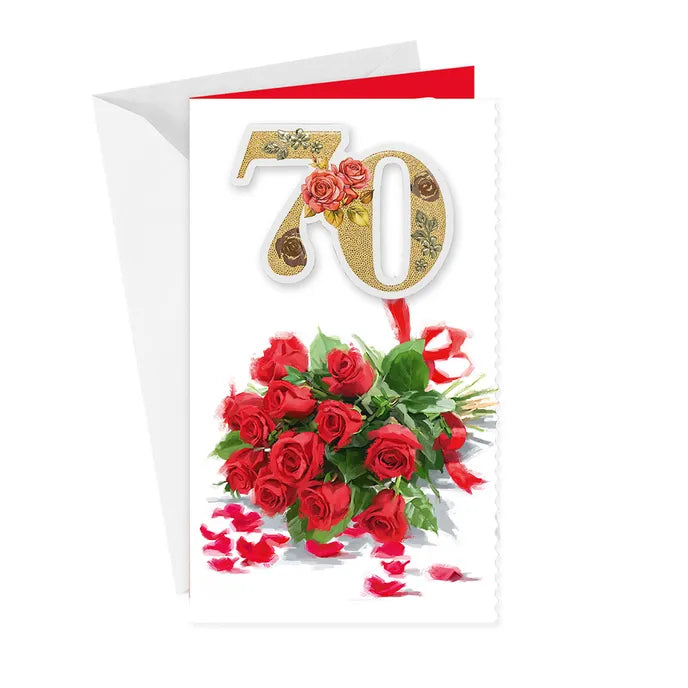 Blahoželanie k 70. narodeninám pre ženu s textom vo vnútri. Súčasťou priania k narodeninám je aj farebne zladená obálka.