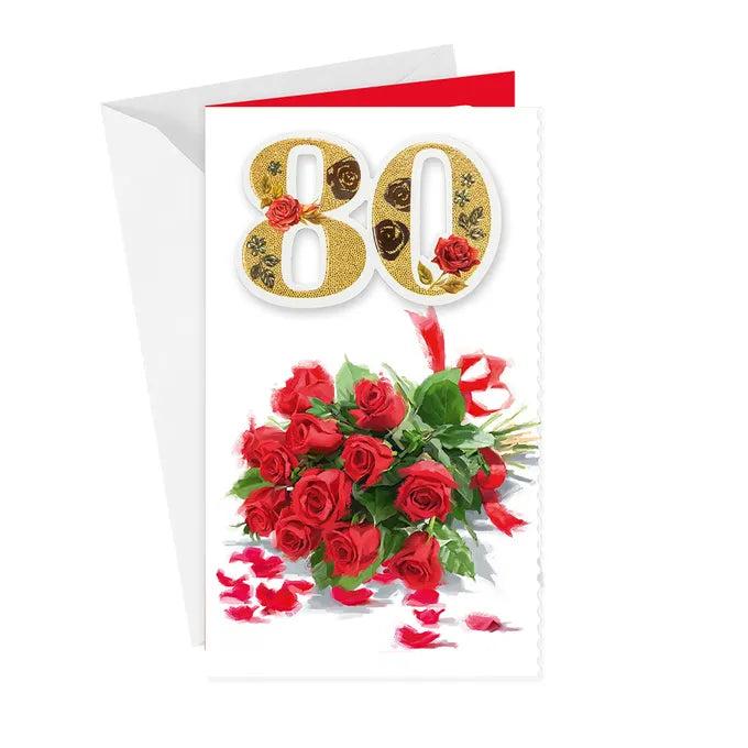 Blahoželanie k 80. narodeninám pre ženu s textom vo vnútri. Súčasťou priania k narodeninám je aj farebne zladená obálka.