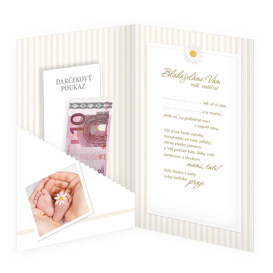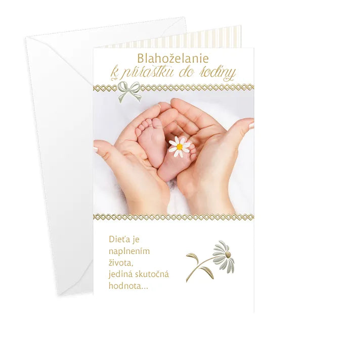 Prianie k narodeniu dieťaťa s textom vo vnútri. Súčasťou blahoželania je aj farebne zladená obálka.