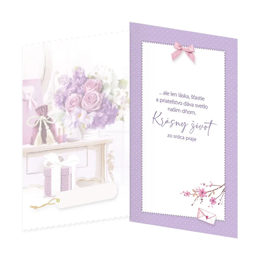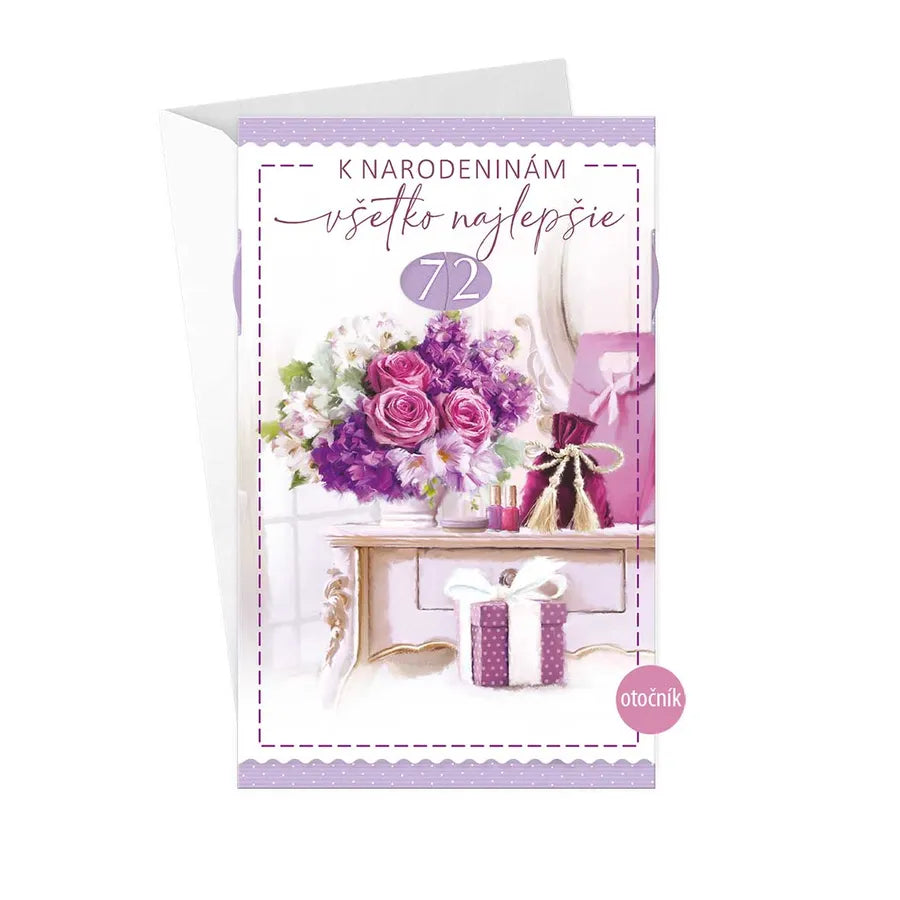 Blahoželanie k narodeninám s otočníkom a textom vo vnútri. Otočník umožňuje výber veku obdarovaného (od 10 po 99). Súčasťou priania je aj farebne zladená obálka.