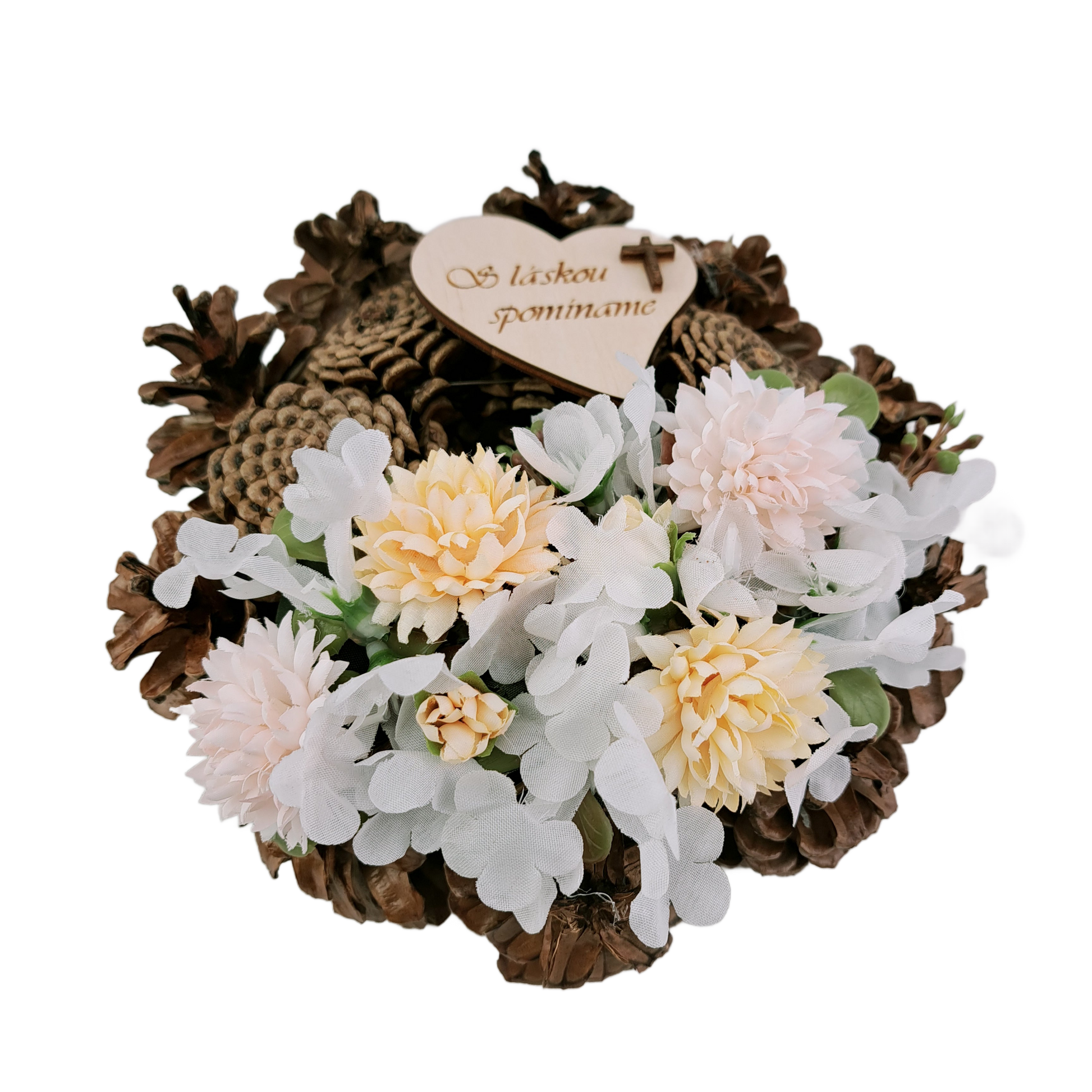 Zloženie: šiškový veniec, umelé kvety, drevený nápis