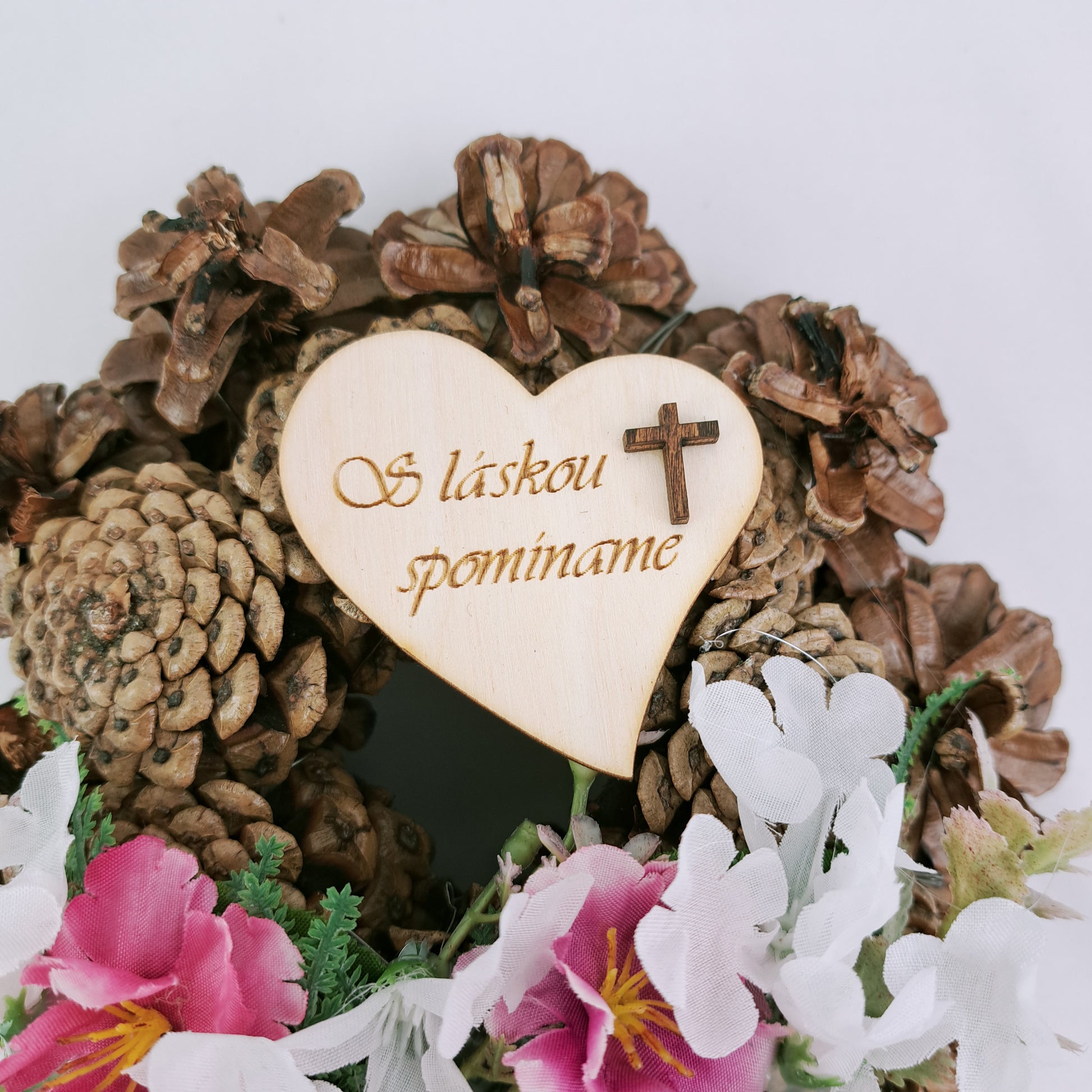Zloženie: šiškový veniec, umelé kvety, drevený nápis