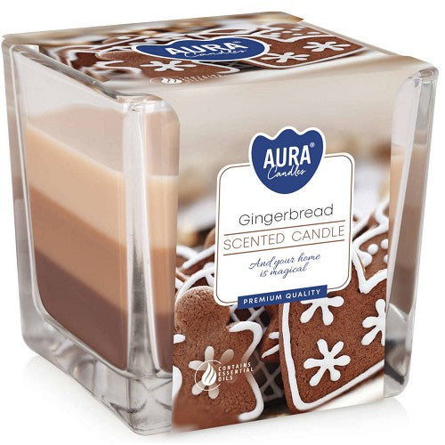 Táto elegantná sviečka v štvorcovom skle upúta svojou trojfarebnou výplňou, ktorá pripomína vrstvy vianočného perníka. Horí až 32 hodín a vďaka dvom knôtom sa rovnomerne topí, vytvára intenzívnejší plameň a krásny svetelný efekt. Váš domov naplní hrejivou sviatočnou atmosférou.