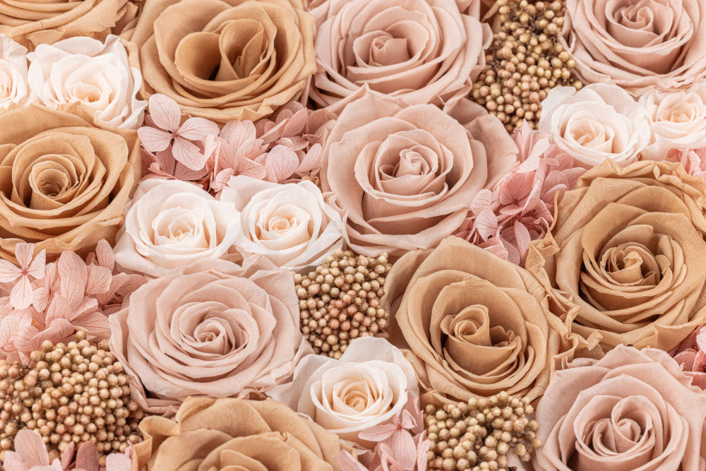 Druhy: ruže v telových (nude) a ružových odtieňoch, krémové diosmi, ružová hortenzia