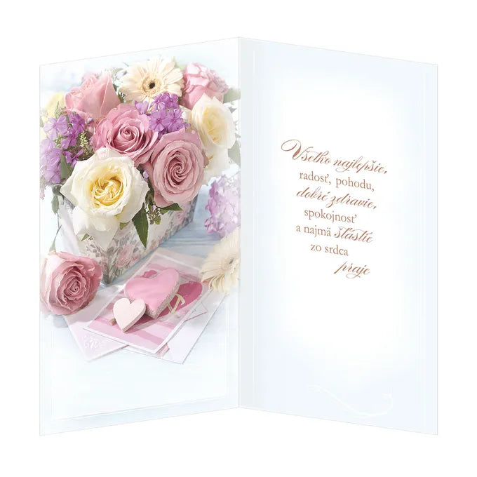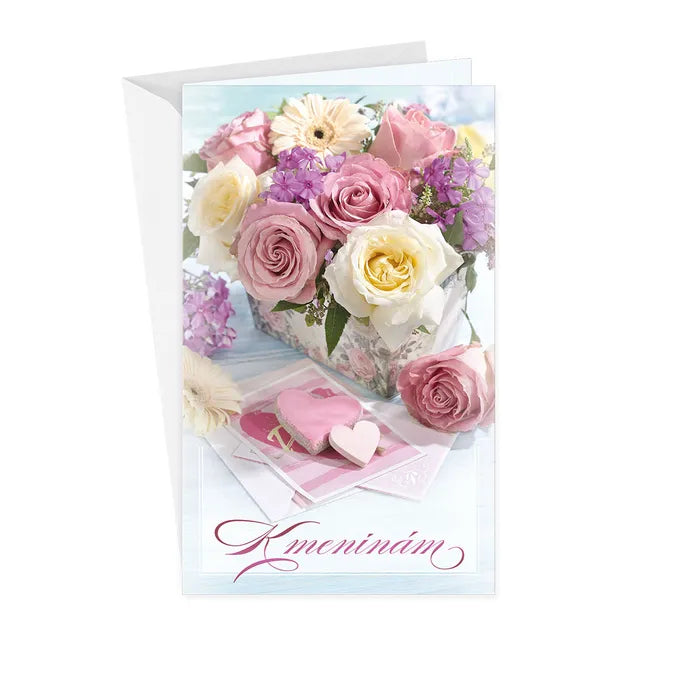 Blahoželanie k meninám pre ženu. Text vo vnútri priania. Súčasťou priania je aj farebne zladená obálka.