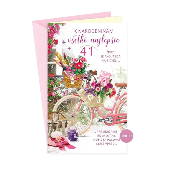 Blahoželanie k narodeninám s otočníkom a textom vo vnútri. Otočník umožňuje výber veku obdarovaného. Súčasťou priania je aj farebne zladená obálka.