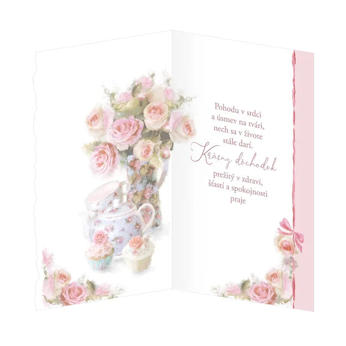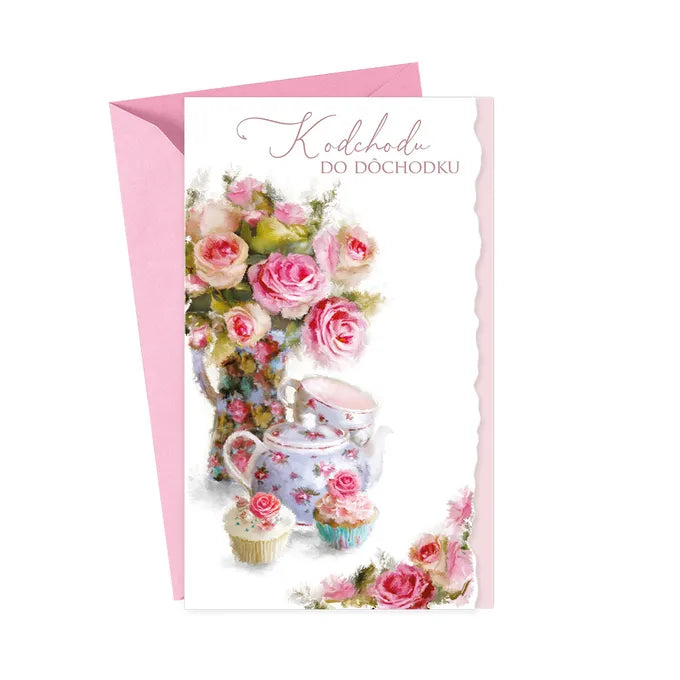 Blahoželanie k odchodu do dôchodku s textom vo vnútri. Súčasťou priania je aj farebne zladená obálka.
