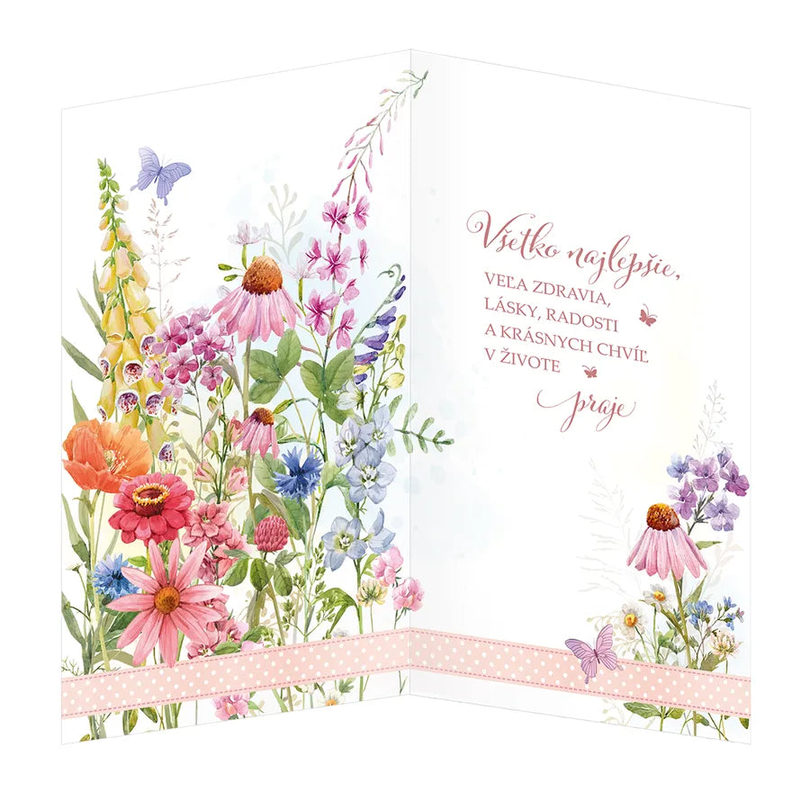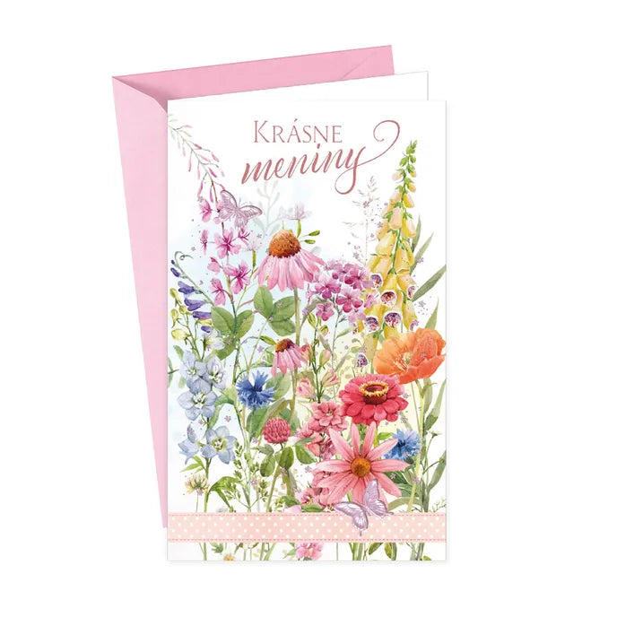 Blahoželanie k meninám s textom vo vnútri. Súčasťou priania je aj farebne zladená obálka.