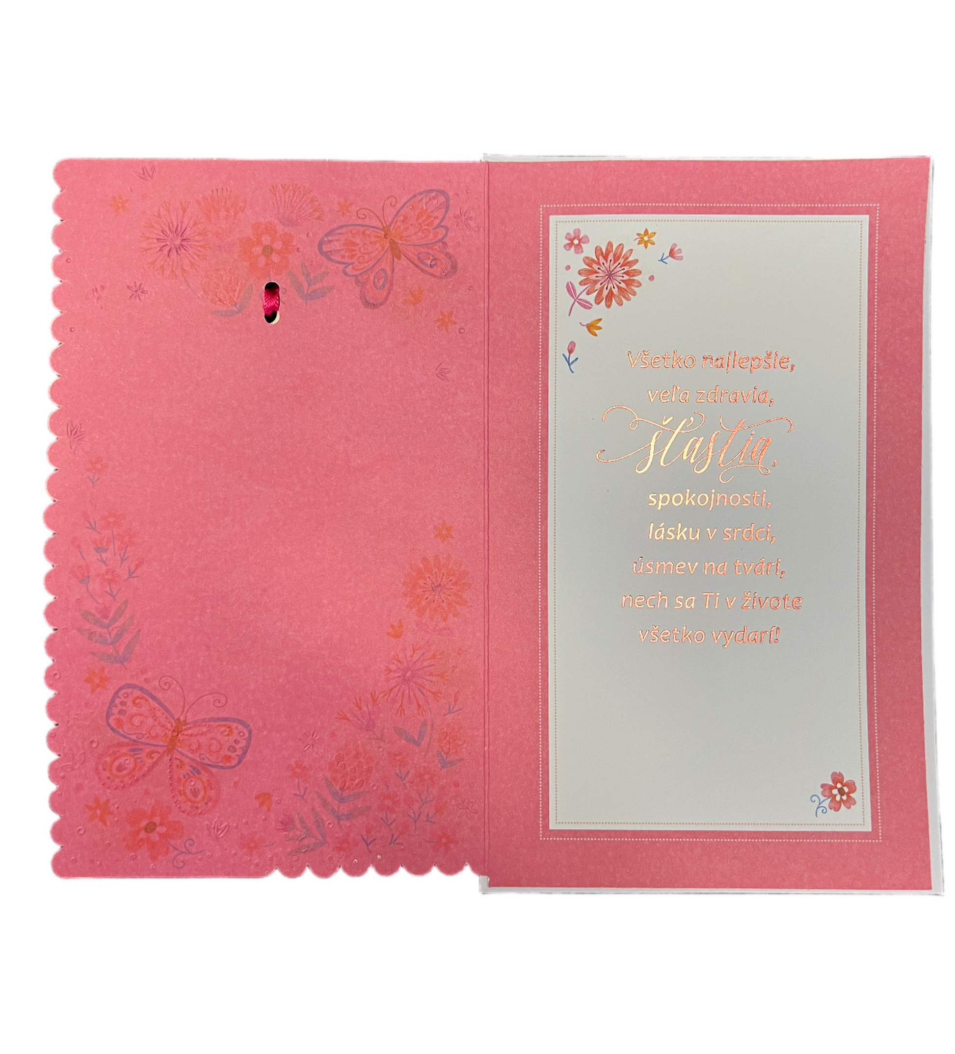 Blahoželanie k meninám pre ženu. Text vo vnútri priania. Súčasťou priania je aj farebne zladená obálka.
