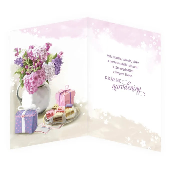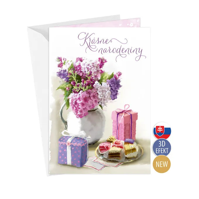 Blahoželanie k narodeninám s textom vo vnútri. 3D efekt umocňuje dojem priestoru. Súčasťou priania je aj farebne zladená obálka..
