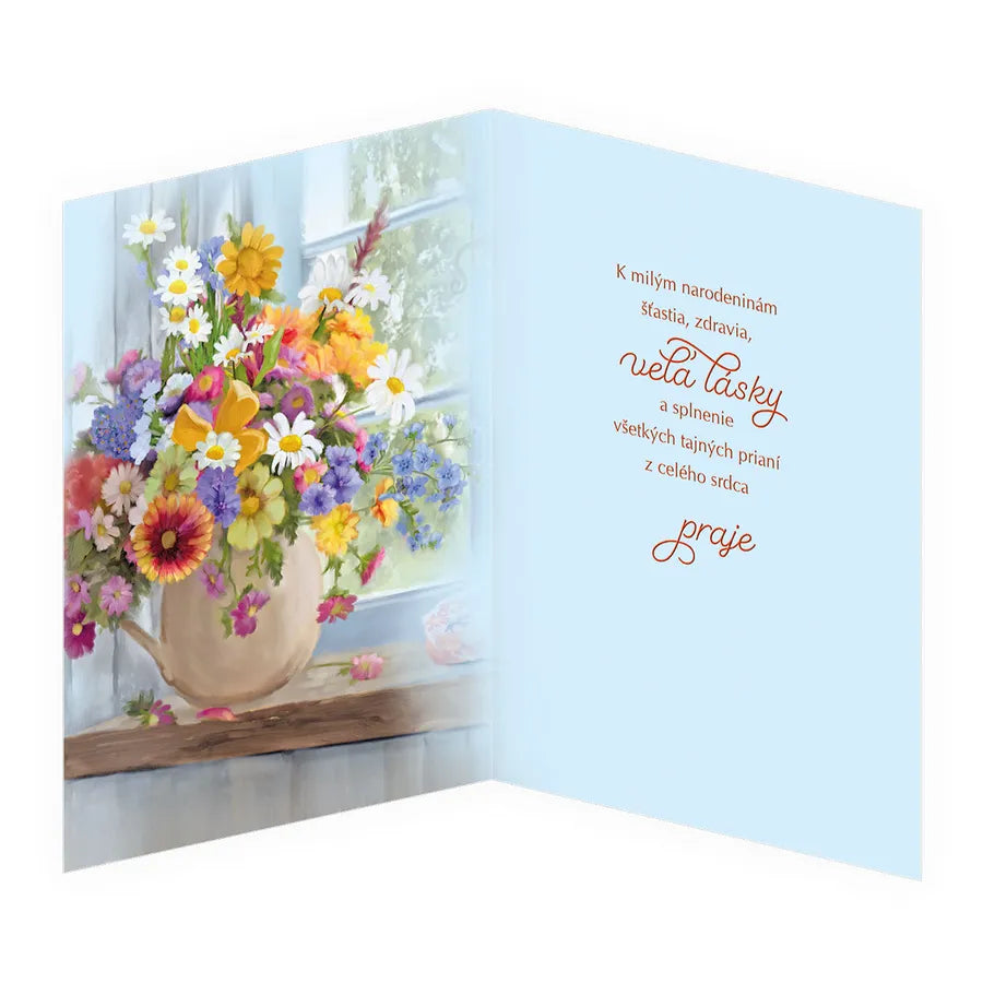 Blahoželanie k narodeninám vhodné pre ženu, s textom vo vnútri. 3D efekt umocňuje dojem priestoru. Súčasťou priania je aj farebne zladená obálka..