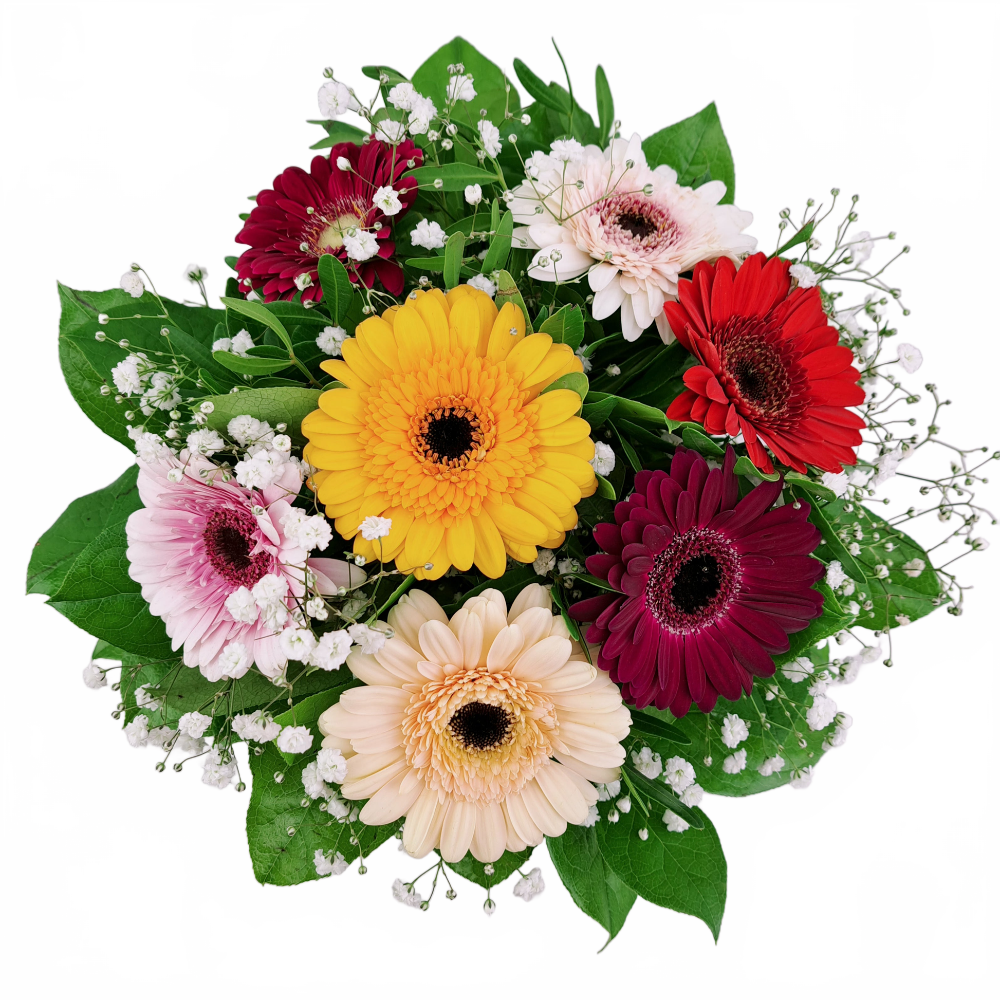 Kytica pre radosť – Farebné gerbery je malý no výnimočný darček, ktorý poteší pri akejkoľvek príležitosti. Živé farebné gerbery v kombinácii s jemnou gipsophillou a bohatou zelenou pistáciou a salalom vytvárajú sviežu a radostnú kompozíciu. Zelená stuha rafia pridáva prírodný a ľahký dotyk.