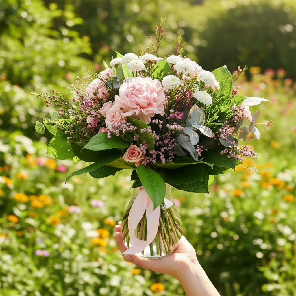 a karafiátov v kombinácii s bielymi akcentmi limonky, gipsophilly a chamelaucia vytvárajú elegantný a romantický vzhľad. Zelené prvky eukalyptu, pistácie a salalu dodávajú kytici sviežosť a prirodzený šarm. Ružová saténová stuha podčiarkuje sofistikovanosť tejto kytice.