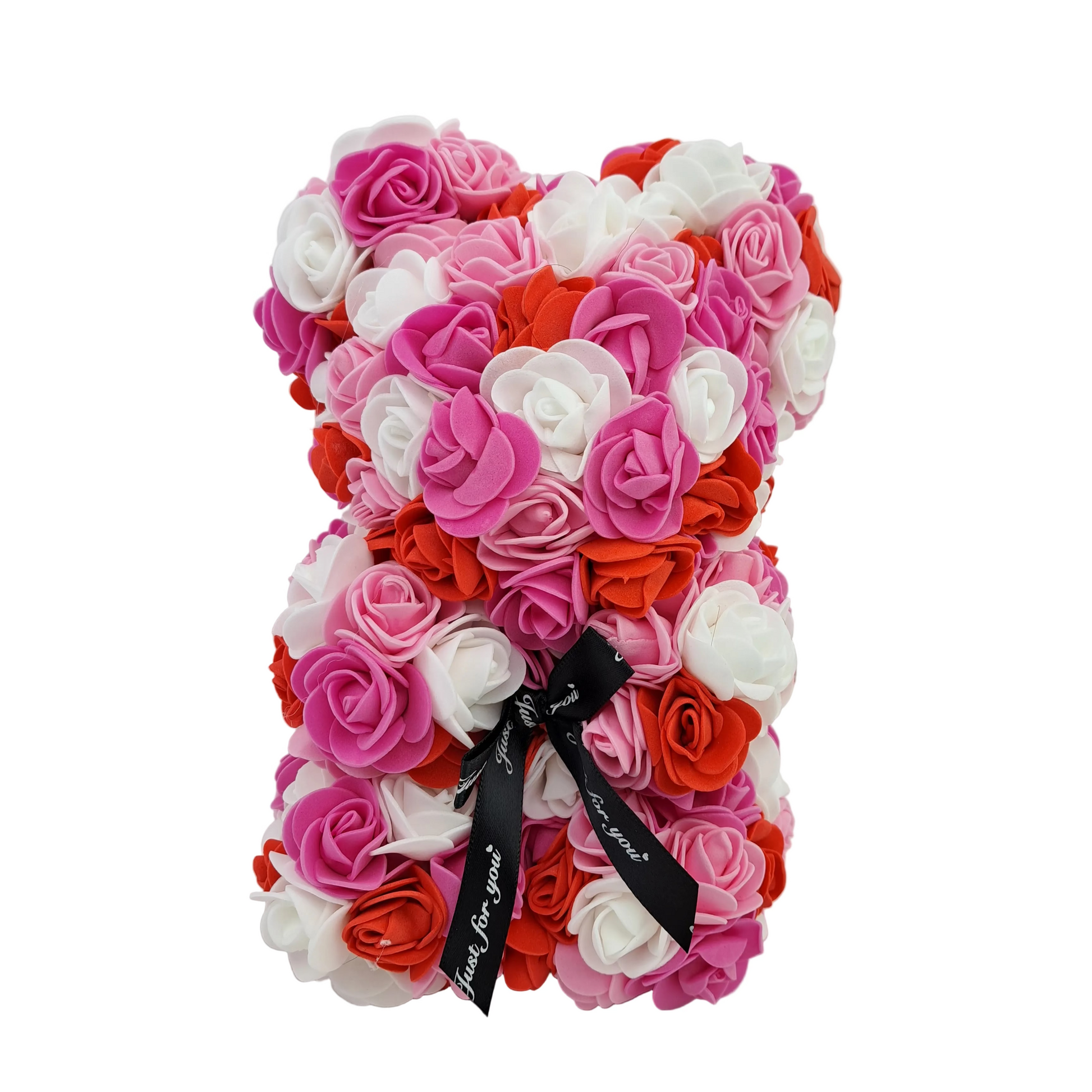 Medvedík z penových ruží v červenej, ružovej, marhuľovej a bielej farbe.