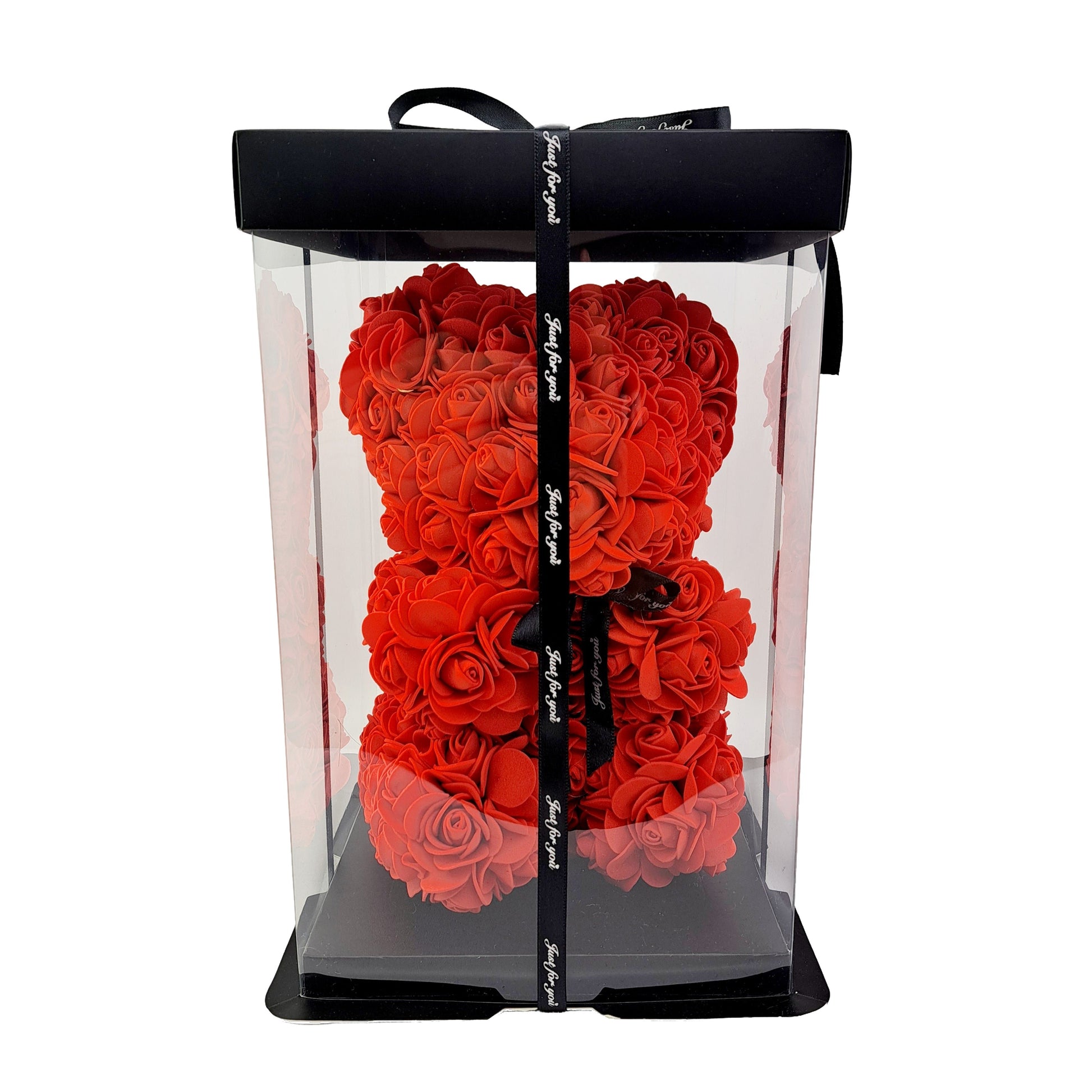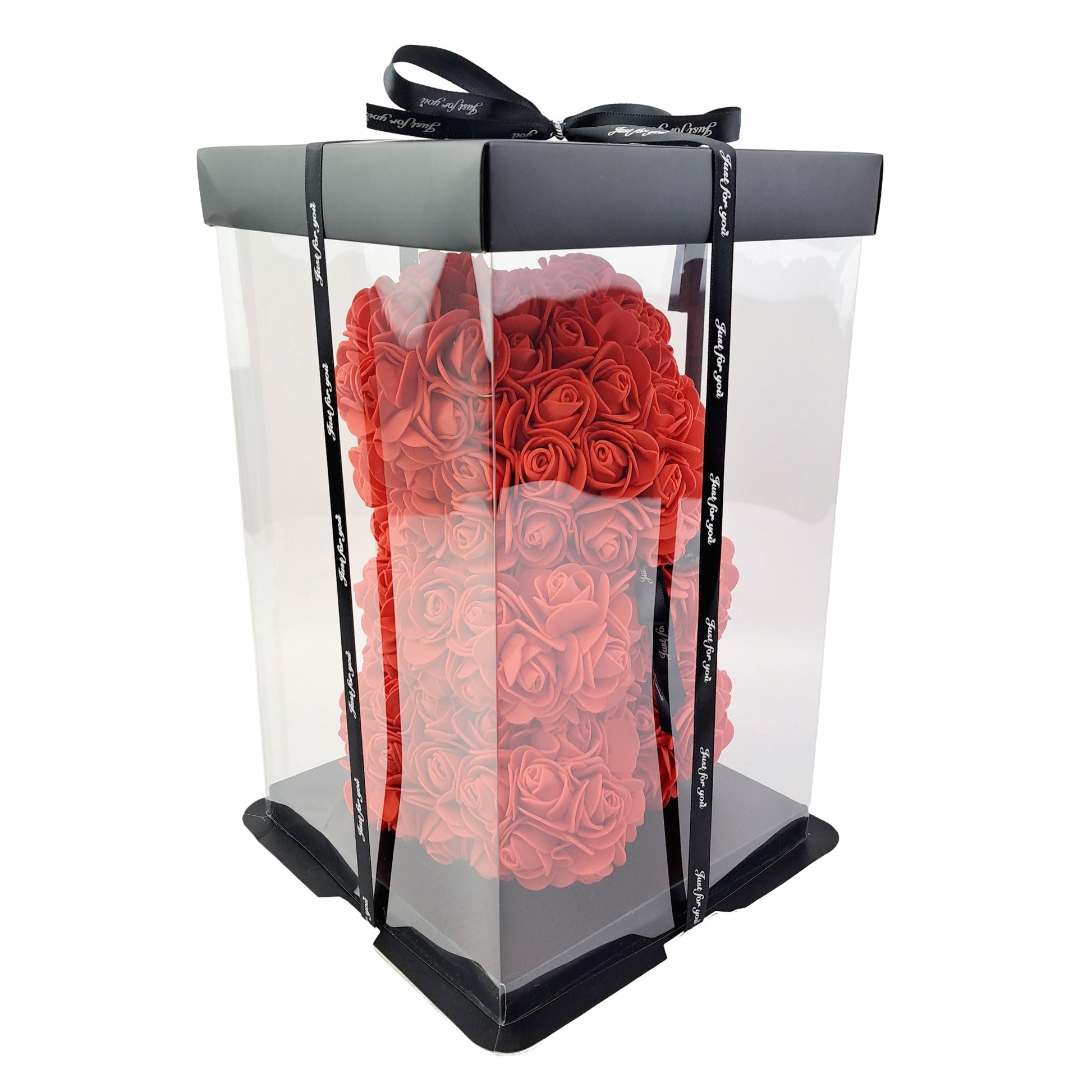 Medvedík z penových ruží v červenej farbe v exkluzívnej krabičke so stuhou.