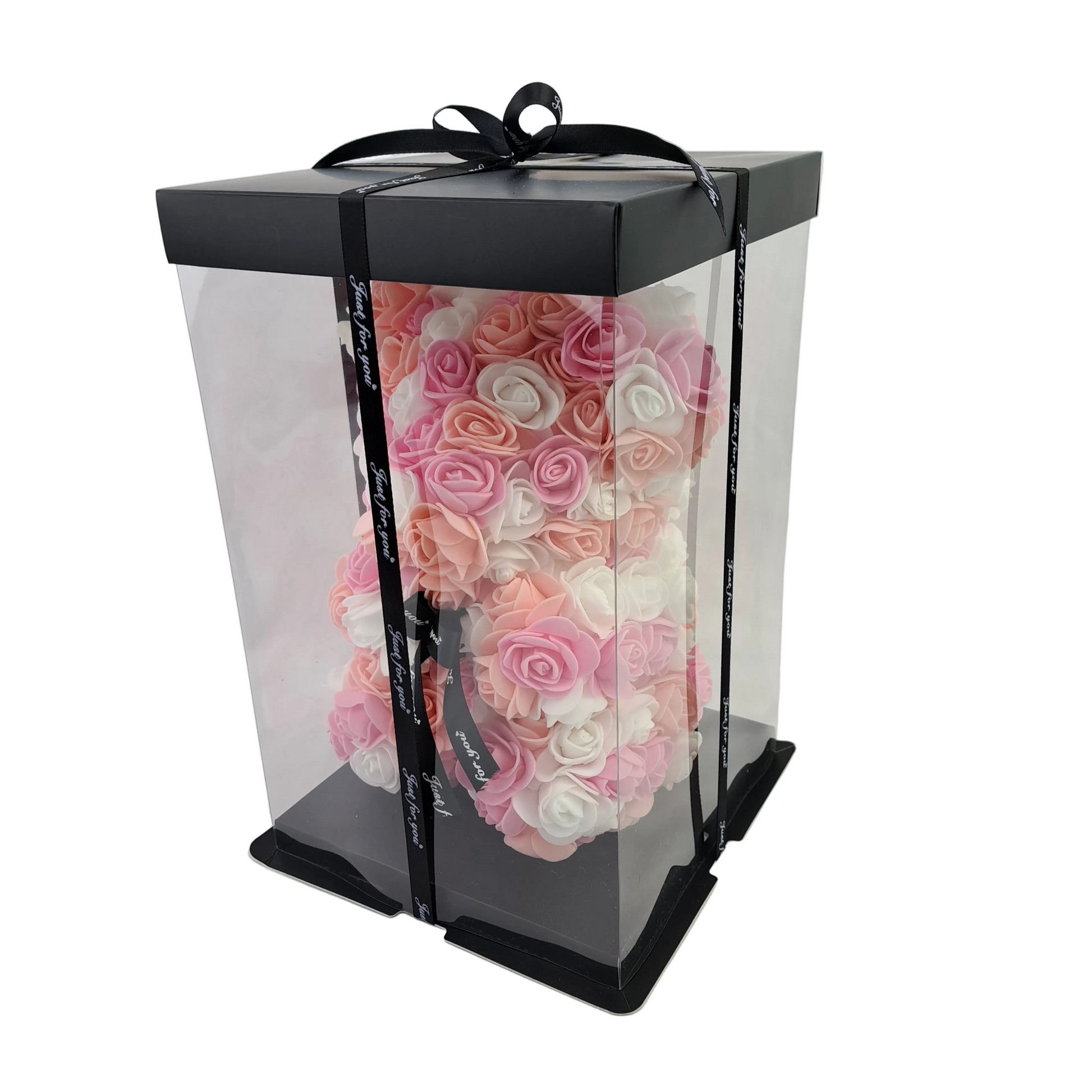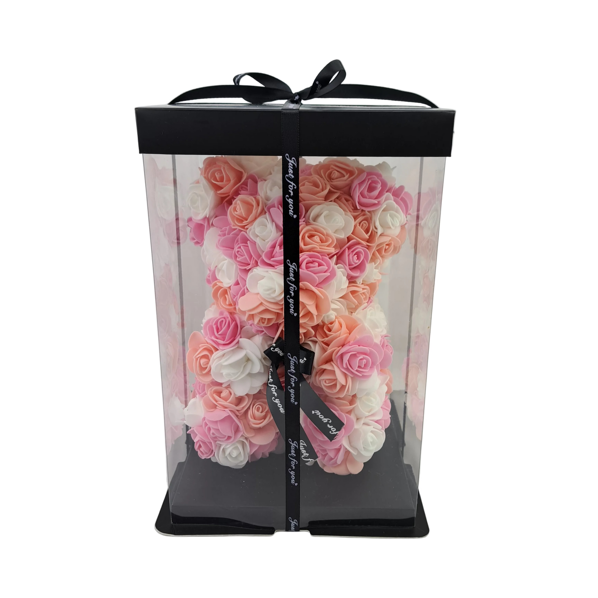 Medvedík z penových ruží v ružovej farbe v exkluzívnej krabičke so stuhou.