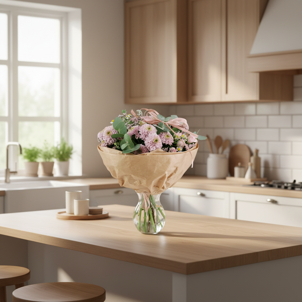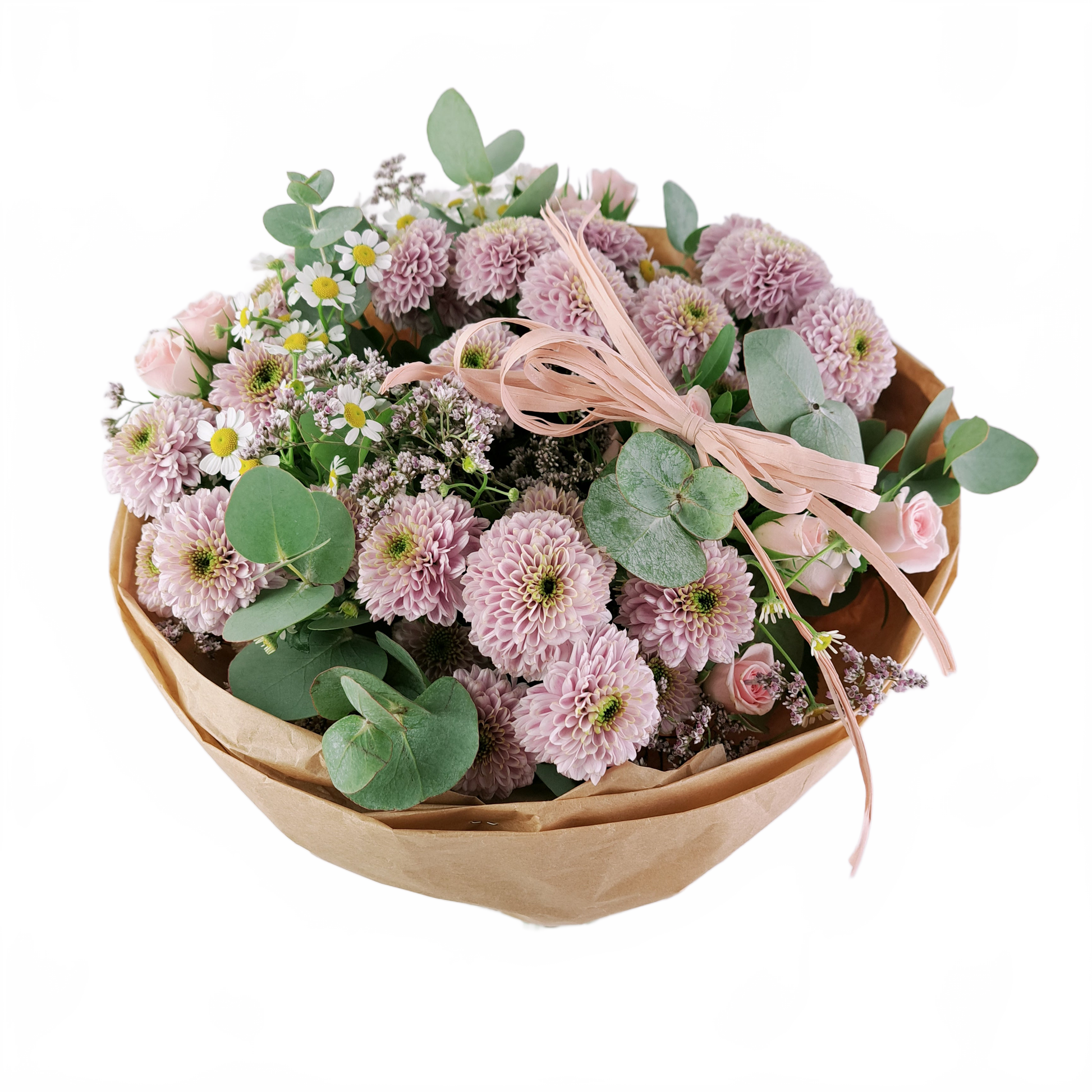 Kytica Santín s eukalyptom prináša sviežu kombináciu jemných ružových trsových ruží a veselých zelených santín, doplnených o voňavý eukalyptus a pistáciu. Tanacetum dodáva celej kompozícii hravosť a ľahkosť, zatiaľ čo naturálny papier a rafia podčiarkujú prirodzený, autentický štýl kytice. Ideálna ako darček pre potešenie alebo ako dekorácia, ktorá rozžiari každý priestor.