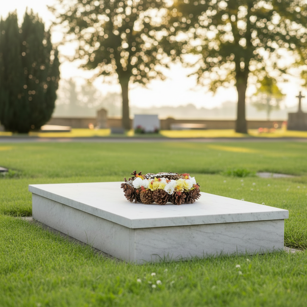 Zloženie: šiškový veniec, umelé kvety, drevený nápis