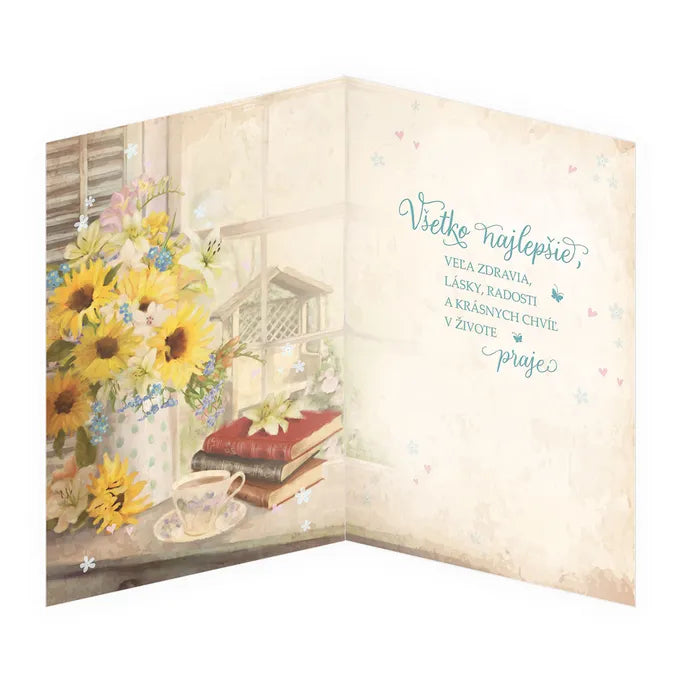 Blahoželanie k narodeninám vhodné pre ženu, s textom vo vnútri. 3D efekt umocňuje dojem priestoru. Súčasťou priania je aj farebne zladená obálka..