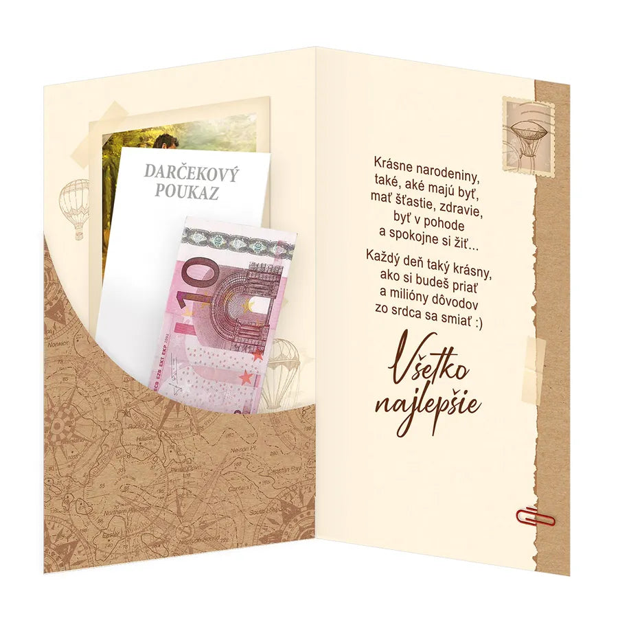 Blahoželanie k narodeninám s textom a záložkou na peniaze vo vnútri blahoželania. Súčasťou priania je aj farebne zladená obálka
