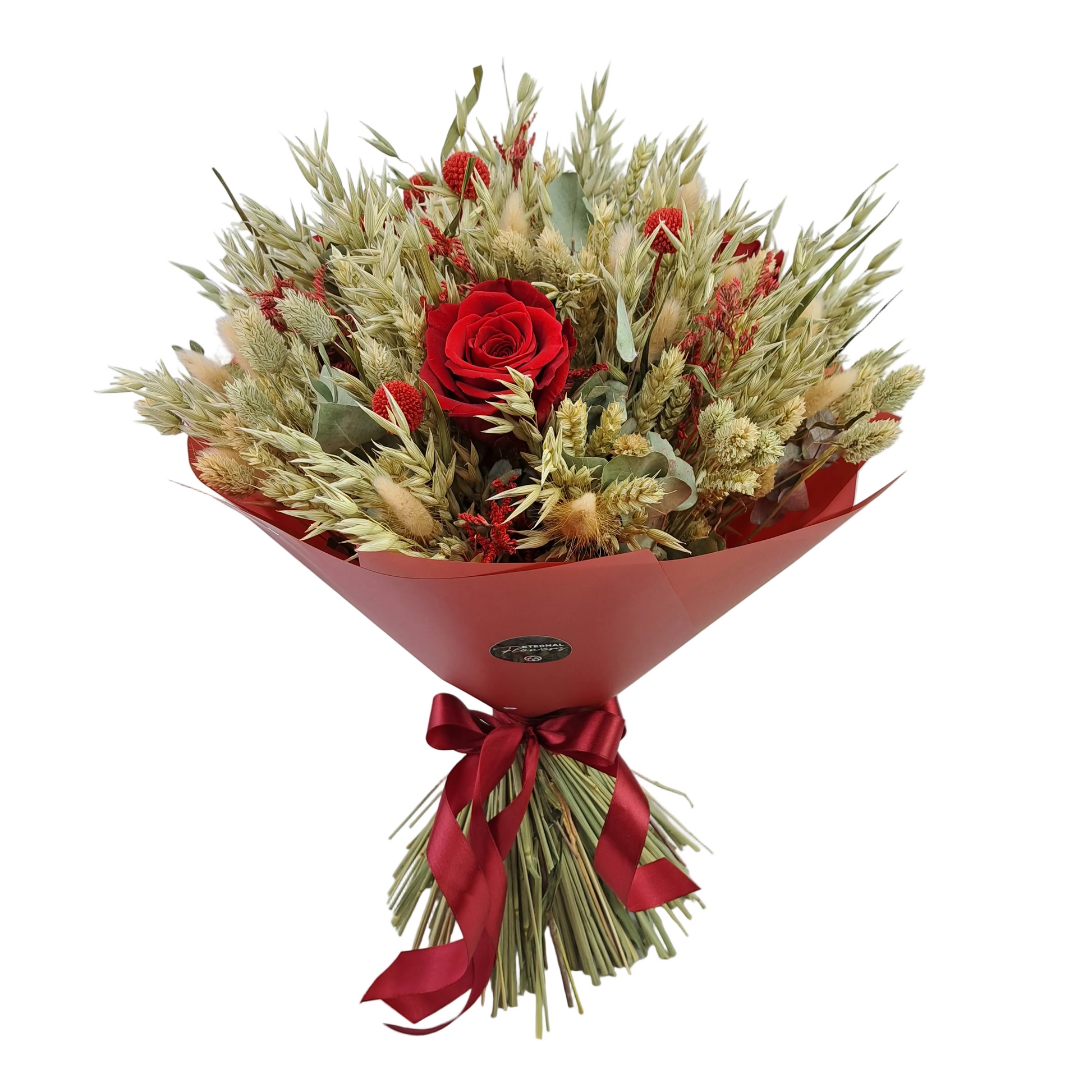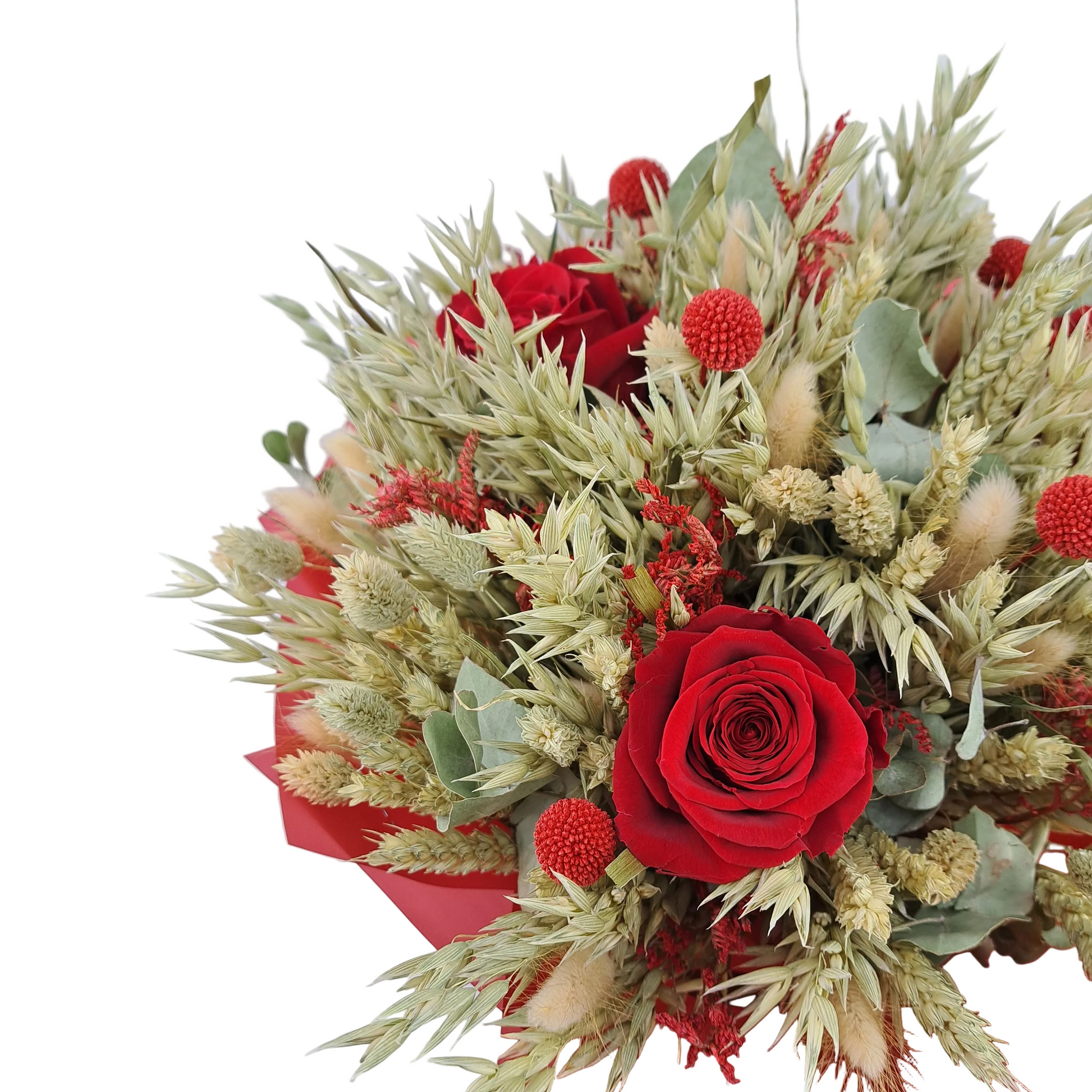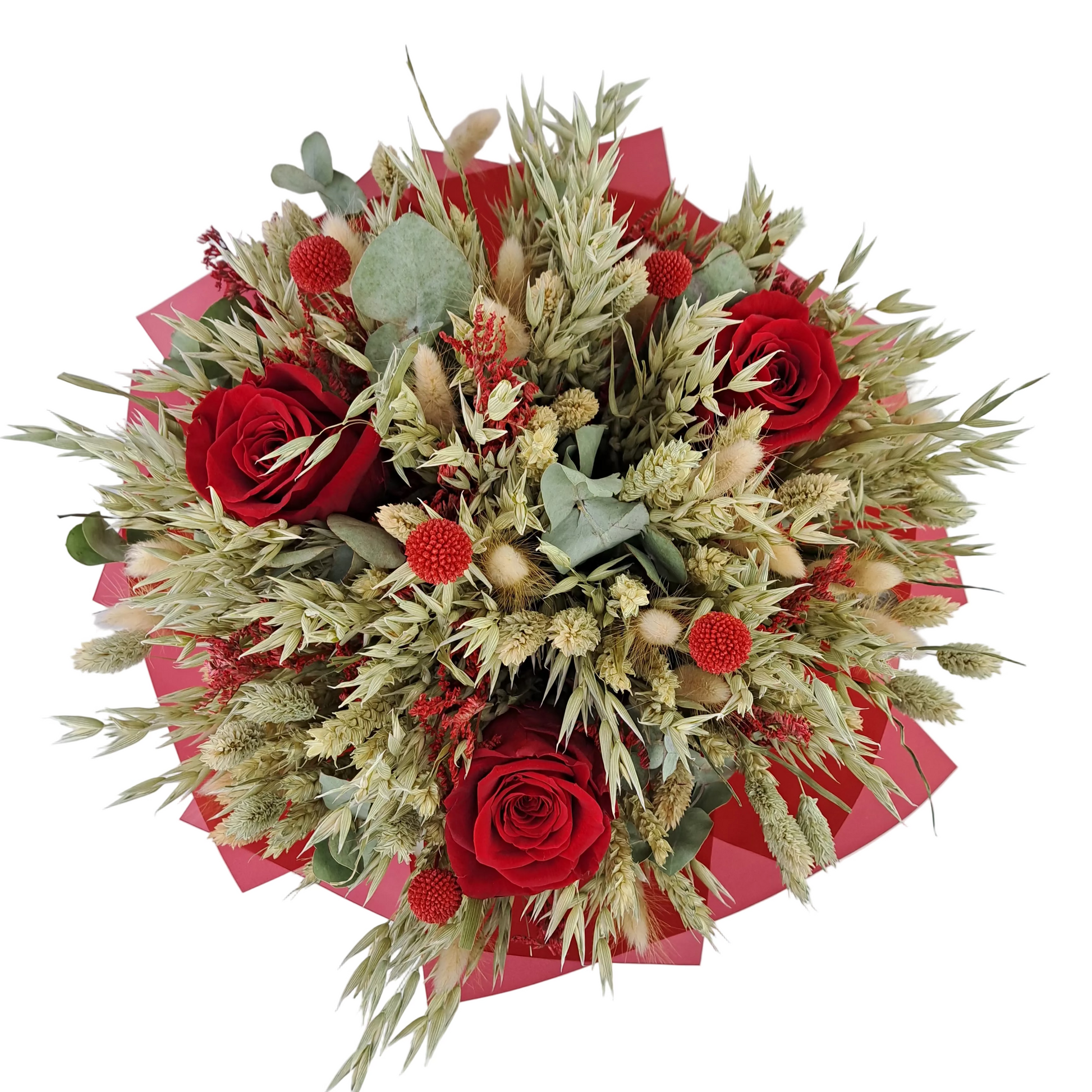 mix sušených kvetov a tráv ( phalaris, avena, triticum, hordeum,graspedia červená, limonka červená, eucalyptus cinereasušený)
