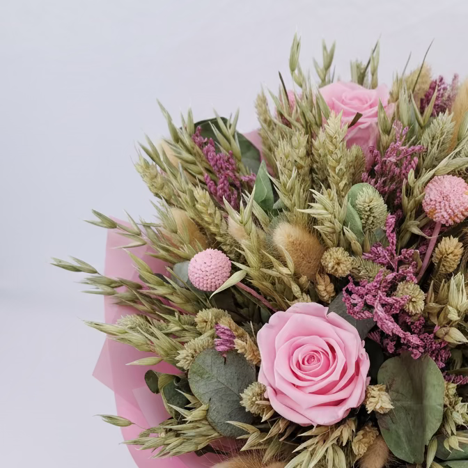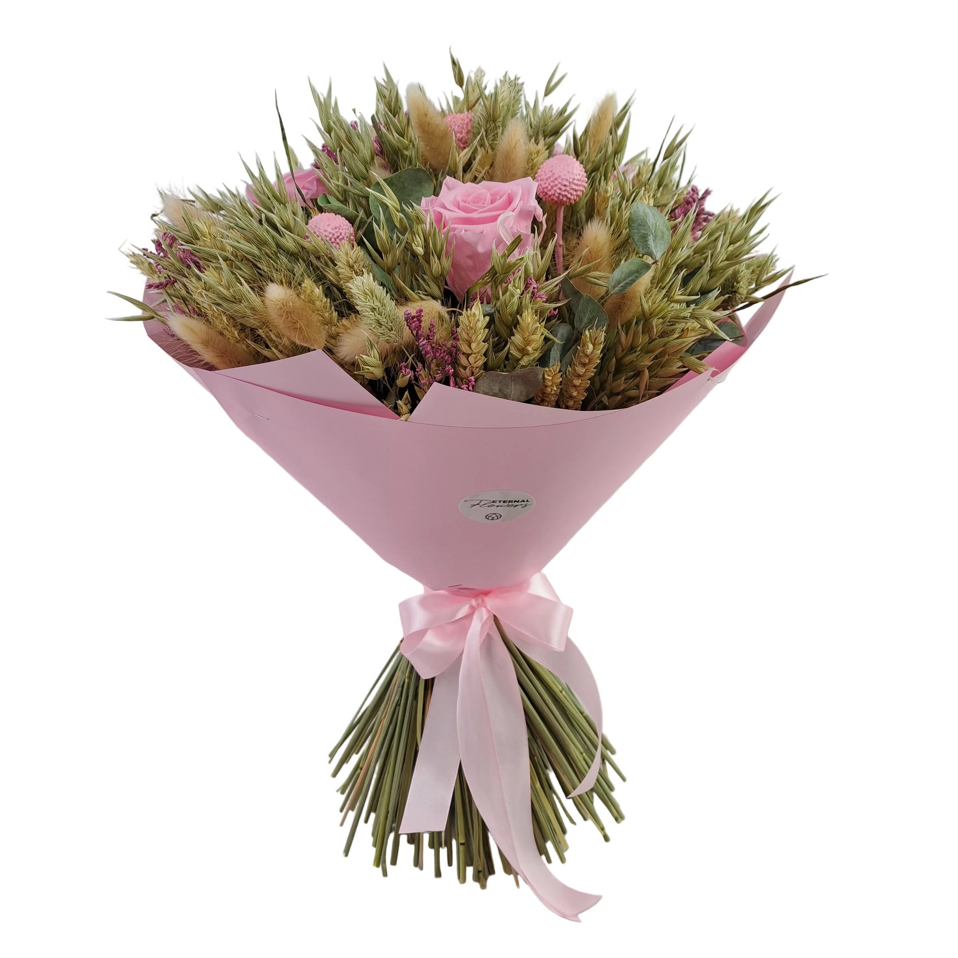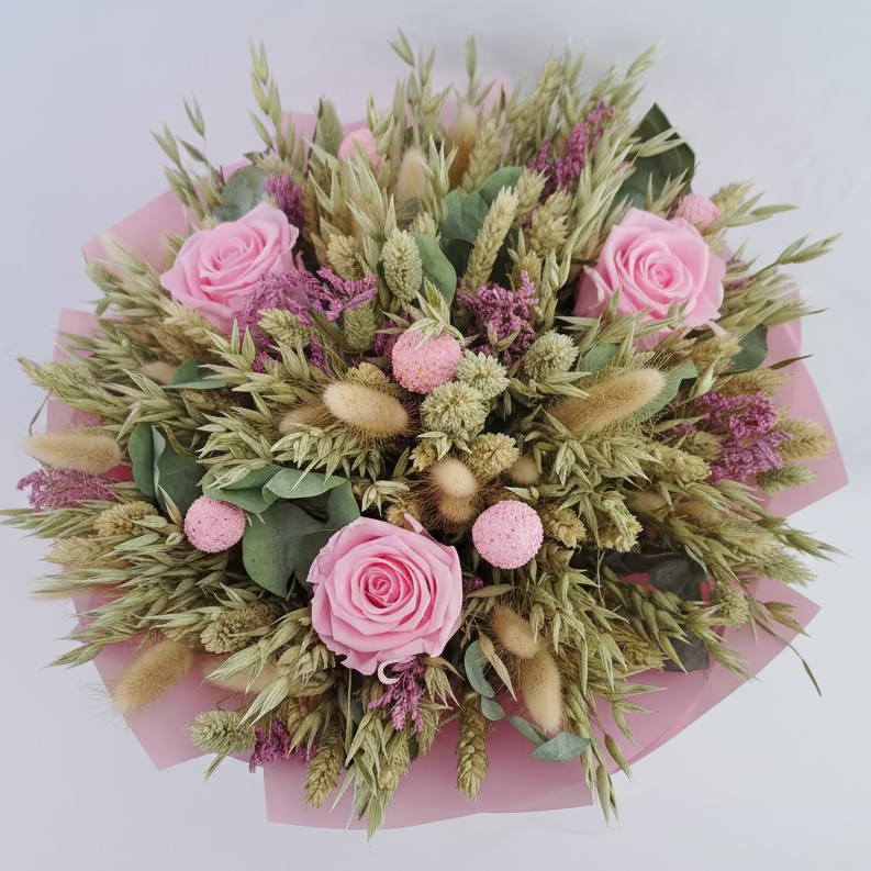 mix sušených kvetov a tráv (phalaris, avena, triticum, hordeum,ruscus stabilizovaný,craspedia farbená, eucalyptus cinerea-sušený)