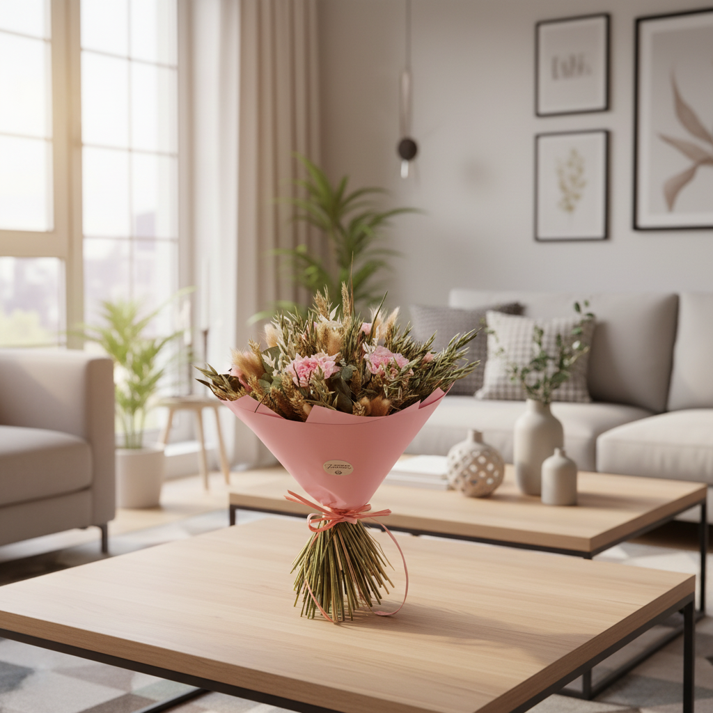 mix sušených kvetov a tráv (limonka ružová,ruscus stabilizovaný, phalaris, avena, triticum, hordeum, eucalyptus cinerea)