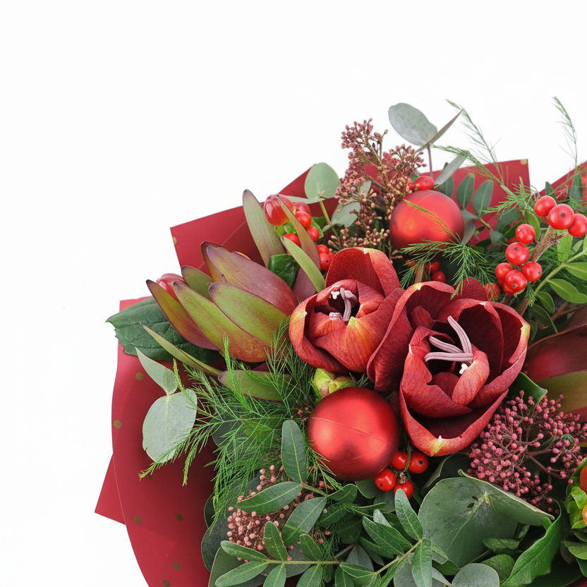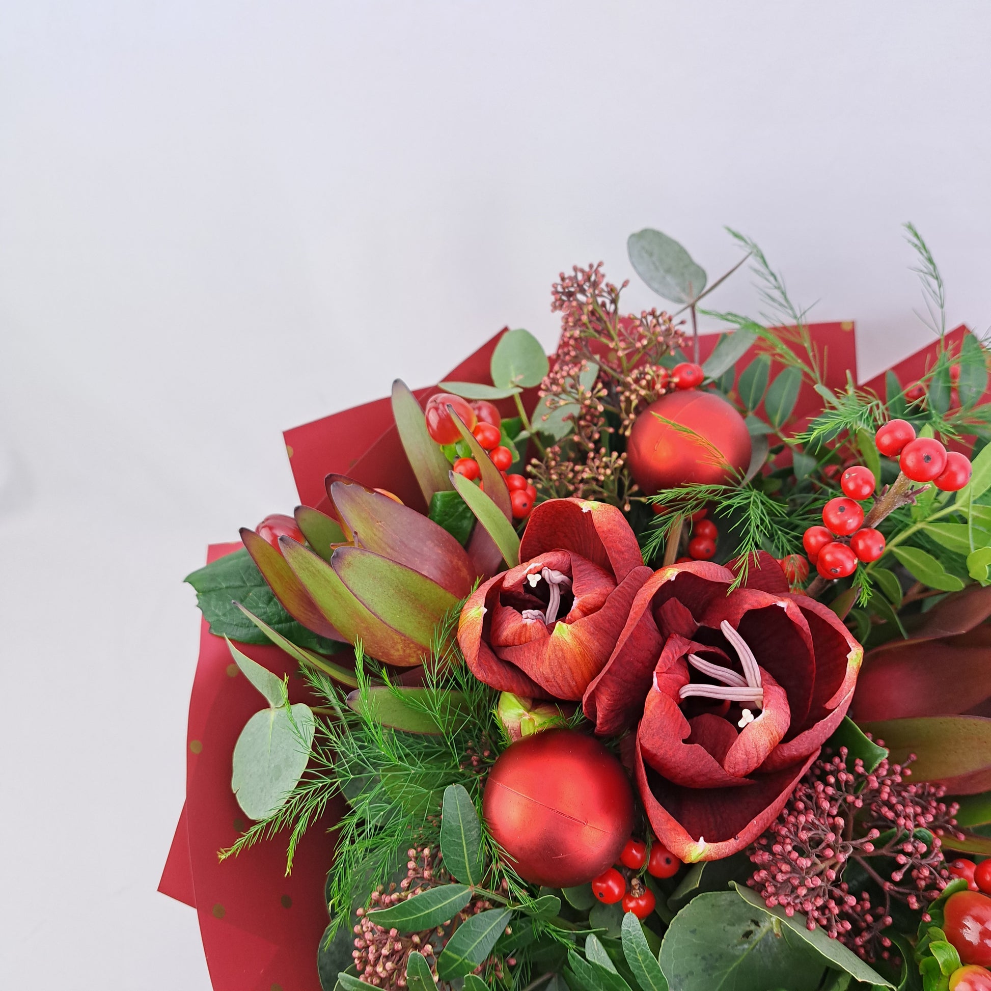 Kytica Červené kúzlo je výrazná, elegantná a plná sviatočnej atmosféry. Dominantný červený amarylis pôsobí luxusne a okamžite upúta pozornosť, zatiaľ čo kombinácia ilexu, hyperica a skimmie dodáva kytici bohatú zimnú farebnosť a hĺbku. Leucadendron vnáša do kompozície zaujímavú textúru a prirodzený kontrast.