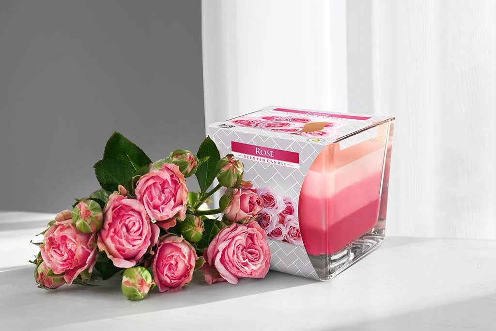 Dvojknôtová vonná sviečka v skle s vôňou ruží. Obsahuje éterické oleje.