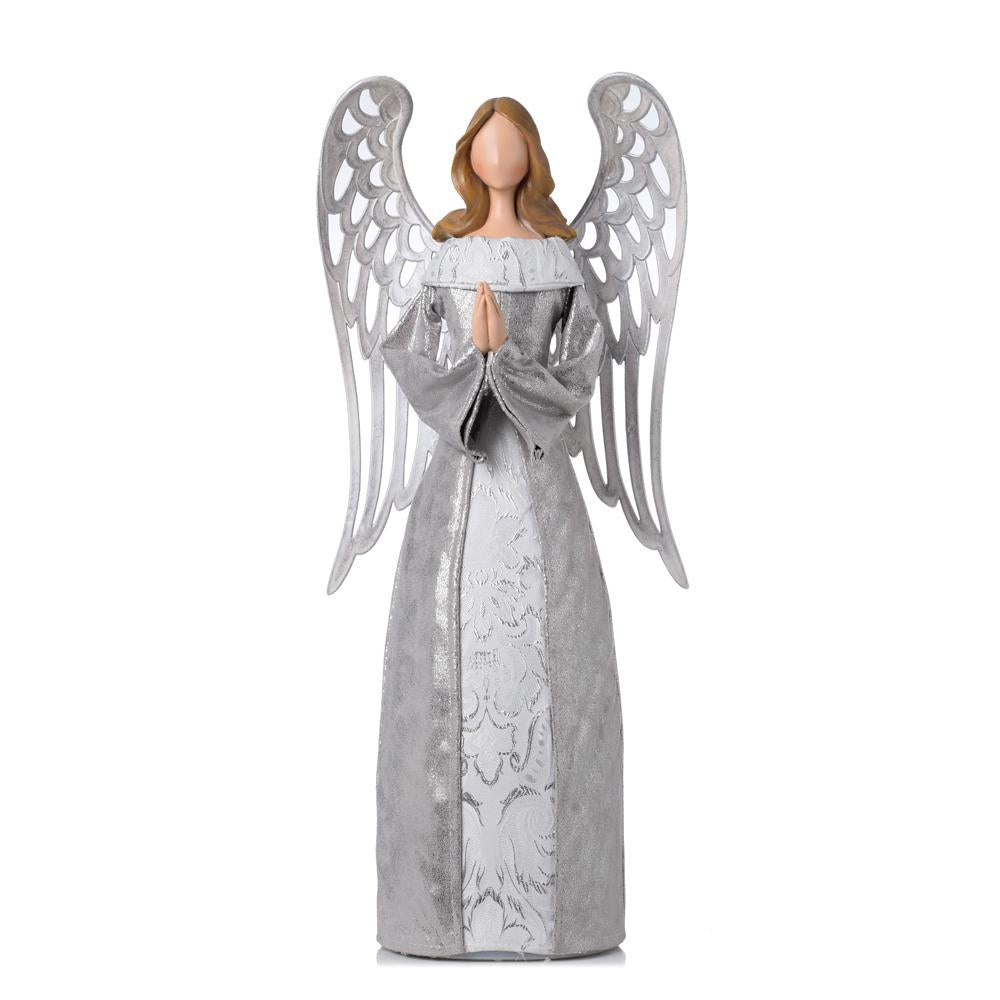 Vianočný anjel s elegantným strieborným dizajnom a LED osvetlením. Je ideálny na dekoráciu počas vianočných sviatkov. Anjel má krásne krídla a modlitbovú pozíciu, čo dodáva atmosféru pokoja a radosti. Rozmery anjela sú 25x15x55,5 cm, čo z neho robí výrazný doplnok do vášho domova.