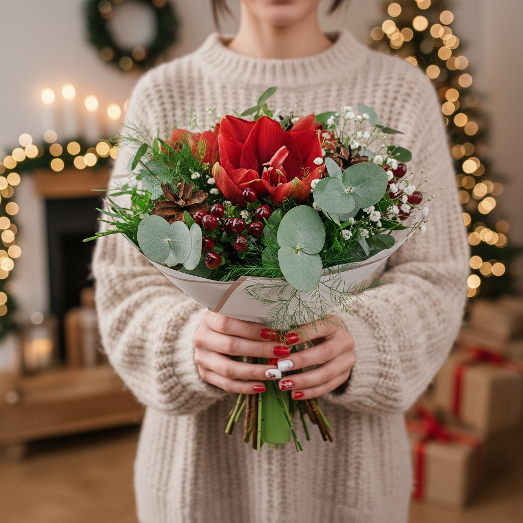 Kytica Červený amarylis s eukalyptom v sebe spája zimnú noblesu a sviatočné teplo. Dominantný amarylis v sýtej červenej farbe pôsobí luxusne a výnimočne, zatiaľ čo hypericum, gipsophilla a eukalyptus dodávajú jemnosť a textúru. Šišky a tuja vnášajú do kompozície prírodný, zimný nádych, ktorý krásne dopĺňa rustikálna stuha rafia. Táto kytica je ideálna ako elegantná ozdoba domova počas zimných sviatkov alebo ako darček s nádychom prírody a noblesy.